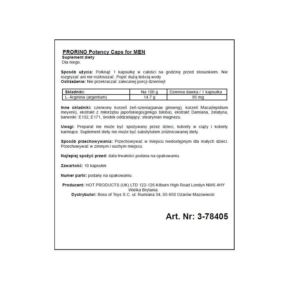 Kapsułki na potencję Prorino Men to unikalny produkt dla mężczyzn uzupełniający dietę o L-argininę i składniki roślinne, które wzmagają męskie libido. Dzięki temu nawet najmniej oporny penis stanie się twardym i w pełni sprawnym członkiem do zaspokajania pragnień partnerki. Zawarty w produkcie żeń-szeń doda energii i pozytywnie wpłynie na długie i rozkoszne chwile w Twojej sypialni. Natomiast miłorząb japoński pozwoli zachować dobre samopoczucie i doda pewności siebie. Ten suplement diety jest idealnym wspomagaczem dla każdego mężczyzny nie tylko dla tych, którzy mają problemy z erekcją.