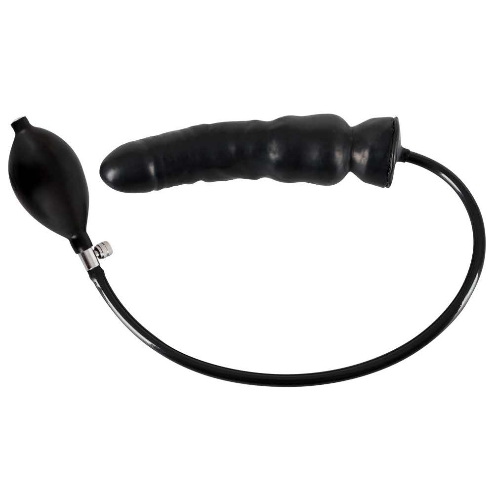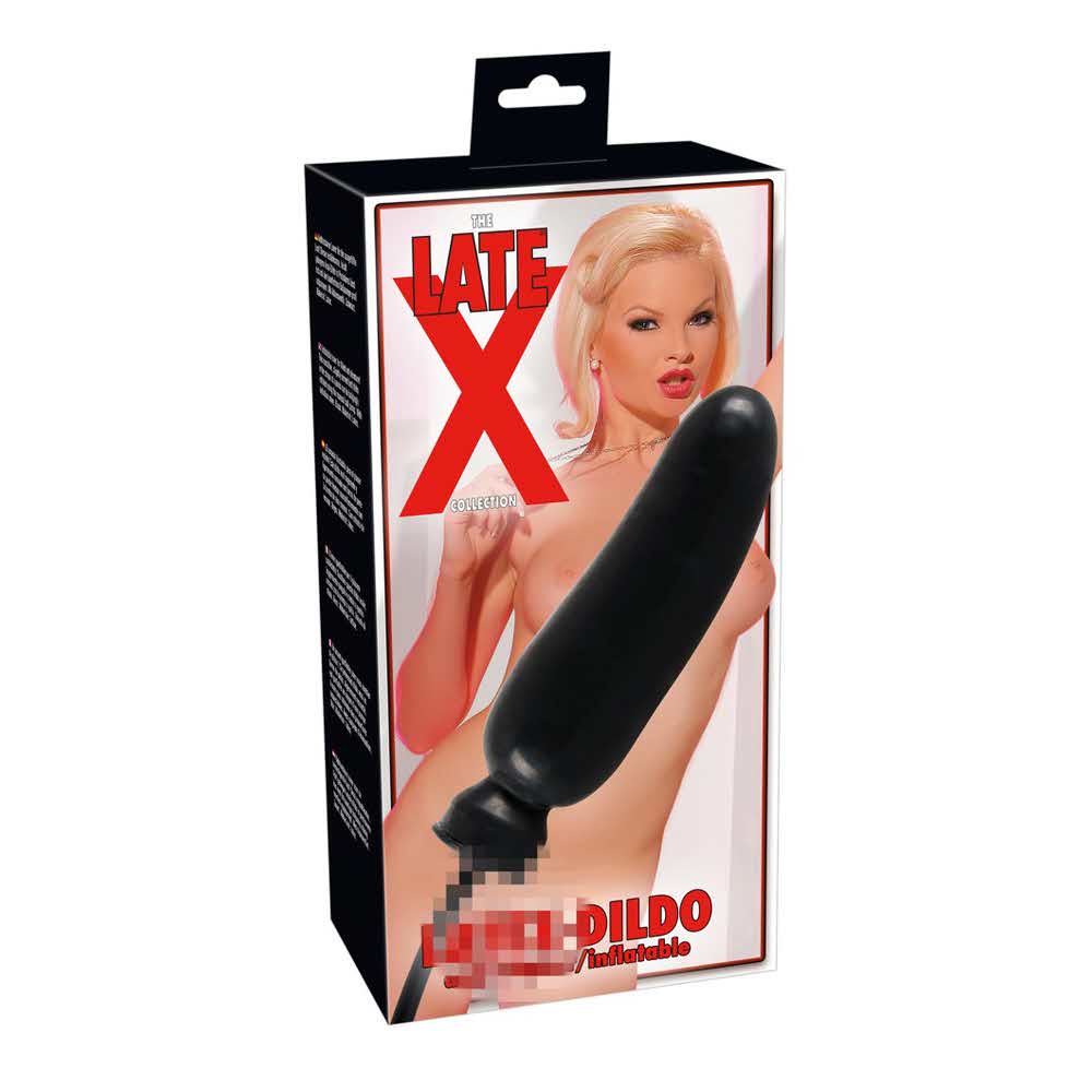 Dildo nadmuchiwane z czarnego lateksu. 20 cm, Ø 3,5-9,8 cm. Głębokość wsunięcia 17 cm. Długość ok. 39 cm. Z pompą ręczną i zaworem spustowym. Materiał: lateks.