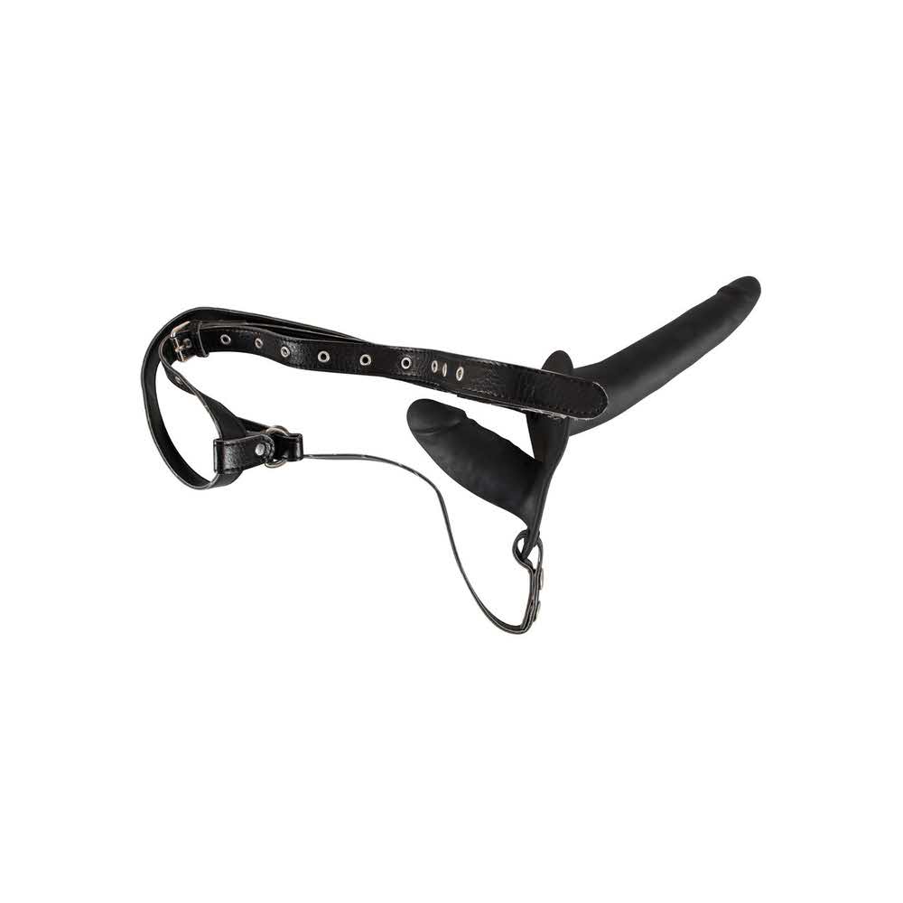 Regulowana sznurowana z dwoma dildami. Czarny. Wymiary: Dildo 1: 15 cm długości, Ø 2,3-3,2 cm. Dildo 2: 8,5 cm długości, Ø 2,2 – 3 cm. Materiał: dilda: silikon, paski: sztuczna skóra.