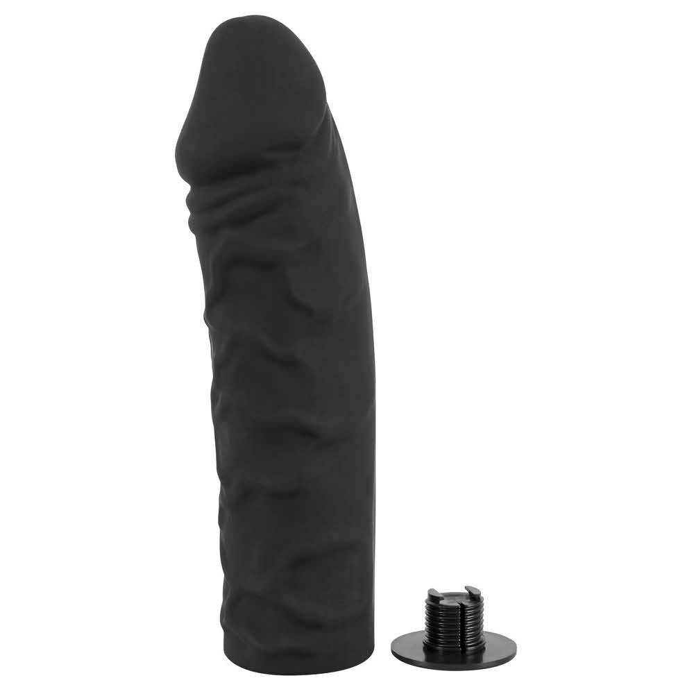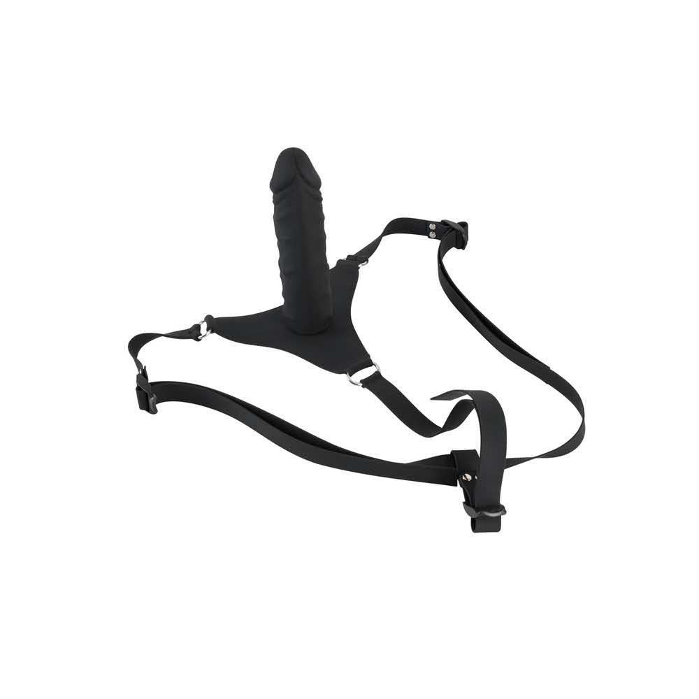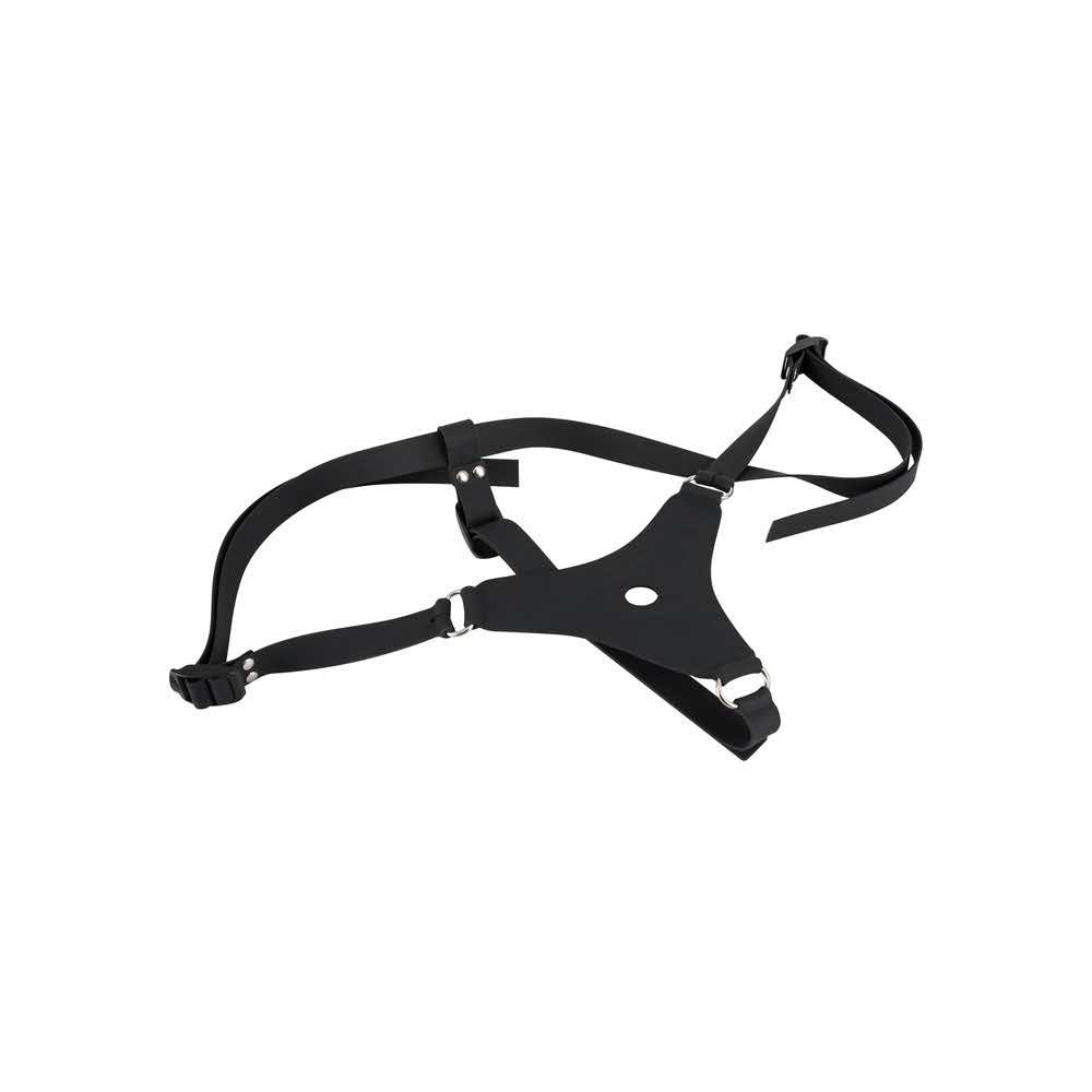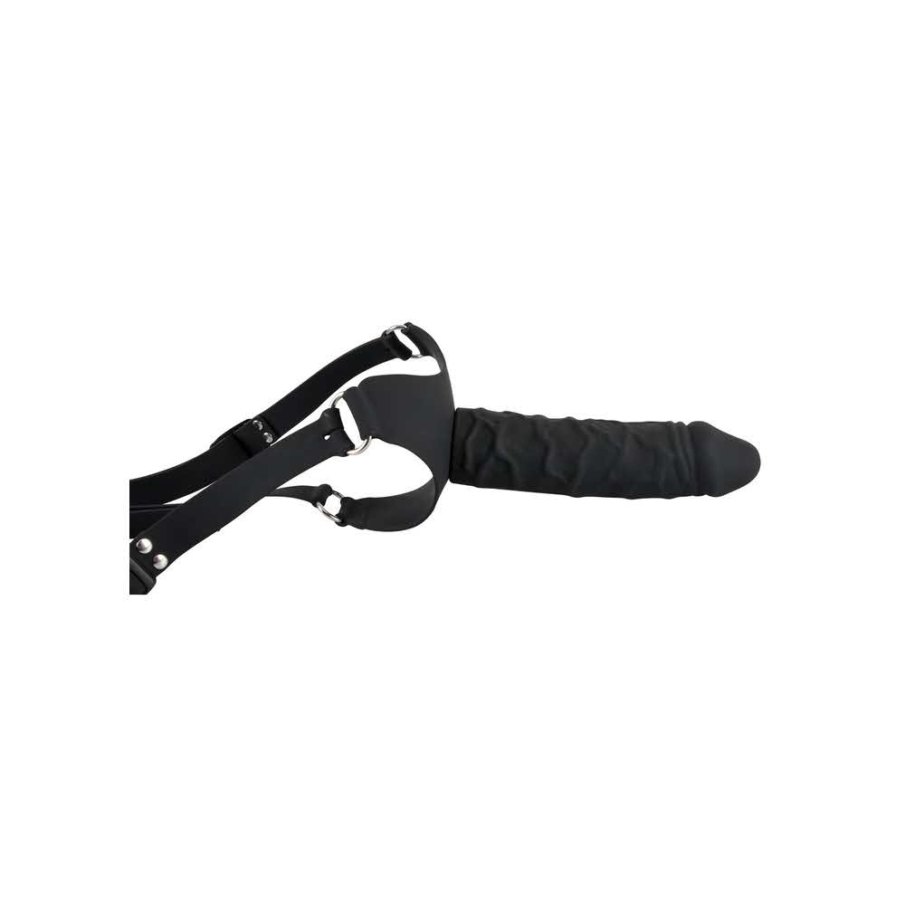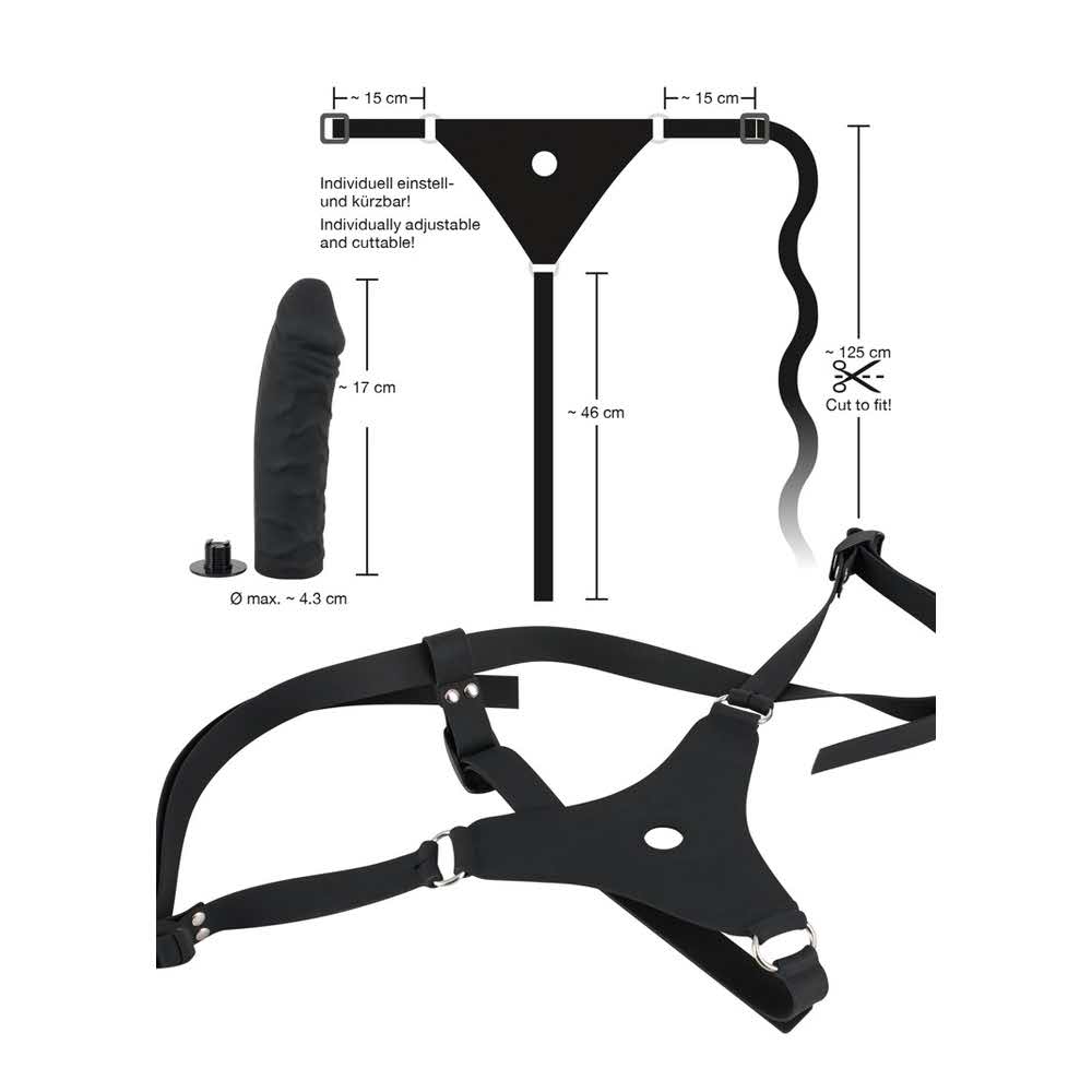 Czarna uprząż z paskiem, którą można regulować i skracać. Krótkie paski po lewej i prawej stronie dildo. Paski mają zapięcia klamrowe. Z dużym bryłowym dildem z wyraźnymi żołędziami i żyłami. Dildo 17 cm długości, Ø 4,3 cm. Materiał: silikon, metal, ABS
