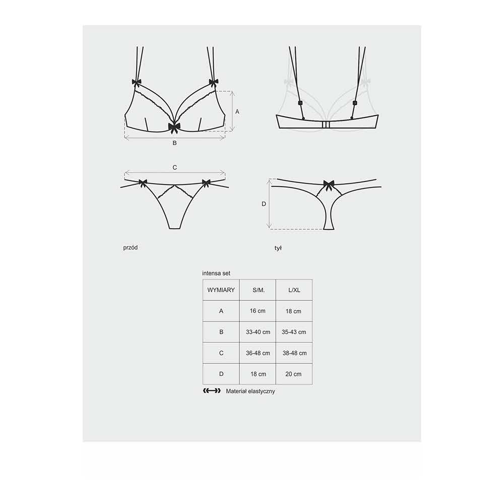 Masz co do tego 100% pewności. Wiesz, że komplet Intensa, który ukryty jest w środku zapewni Wam noc pełną niezwykłych doznań. Ponętny biustonosz w połączeniu z kuszącymi stringami prezentuje się oszałamiająco. Koronka pięknie eksponuje Twój biust, a elastyczne paseczki dodatkowo podkreślają piersi. Słodka kokardka sprawia, że na Twojej twarzy maluje się zadziorny uśmiech. Podwójne paseczki, które oplatają Twoje biodra w połączeniu z kokardkami i koronką są po prostu niesamowite. Nie czekaj dłużej. Pokaż je!