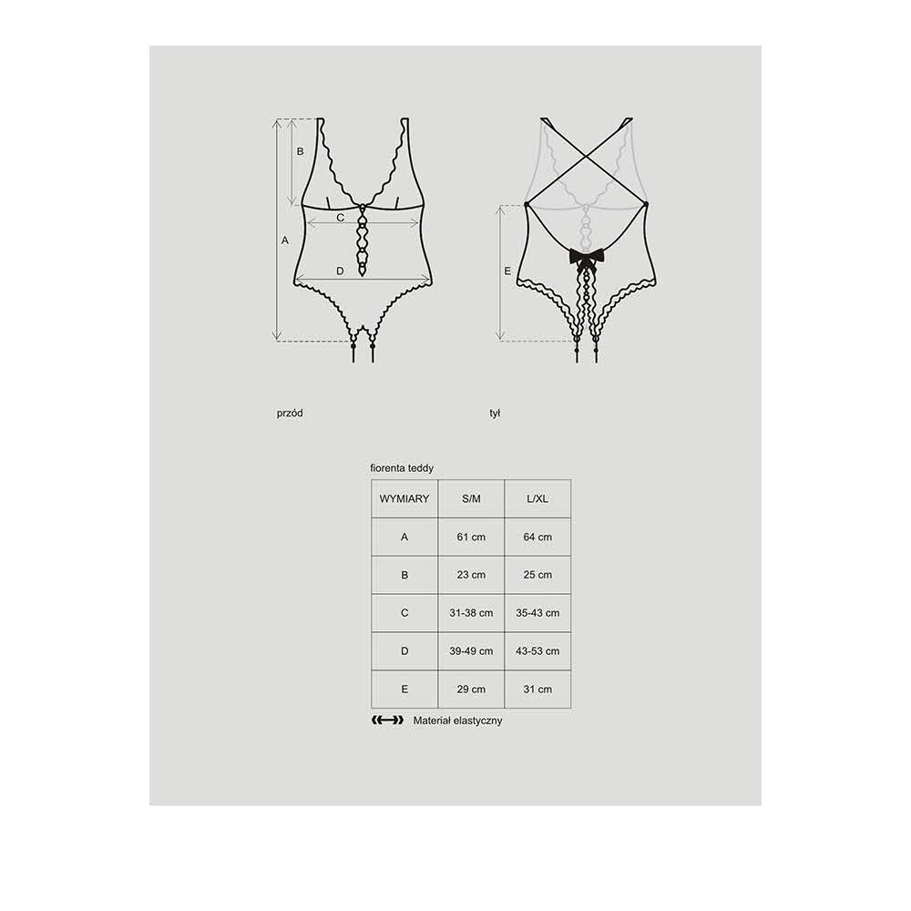 Zapowiedź upojnej nocy? Body Fiorenta! Delikatny kwiatowy motyw + otwarty krok i kuszące zdobienie na plecach = 100% pikanterii! To wybuchowa mieszanka gwarantująca szaloną zabawę! Zaufaj nam, Twój Facet też tak uważa. Nie czekaj więc – pokaż Mu… kto jest dzisiaj górą w Waszej sypialni. Dosłownie! Upojne detale Fiorenta teddy: – kuszące body z kwiatowym motywem – miękkie miseczki eksponują biust – głęboki dekolt podkreśla talię – regulowane ramiączka skrzyżowane na plecach – idealne dopasowanie – z tyłu uwodzicielska, satynowa kokardka – pęknięcie zdobione koronką i perełkami idealnie eksponuje pośladki – pikantny, otwarty krok z regulowanymi paskami – brzegi obszyte koronką – perfekcyjne wykończenia! – całość uszyta z miłego i elastycznego materiału (90% poliamid, 10% elastan) – kategoria: spicy