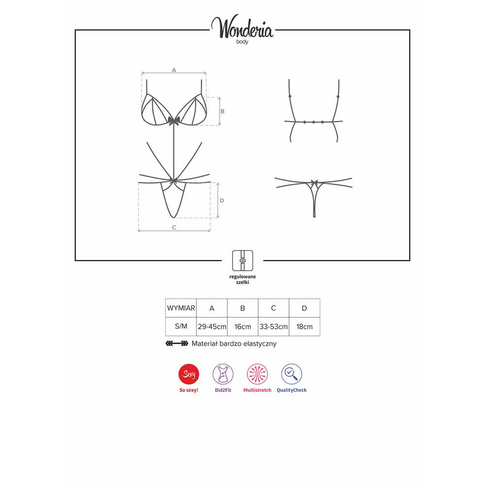 Wyobraź sobie chwilę, w której wchodzisz do Waszej sypialni mając na sobie kreację z seksownych paseczków i zmysłowej koronki. Widzisz jego podekscytowane spojrzenie? Wonderia pomoże Ci zrealizować ten plan! Tym razem totalnie go zaskoczysz. Oto super kuszące body w niepowtarzalnym fasonie! Rozpocznij tę noc wyjątkową rozgrzewką zmysłów.
