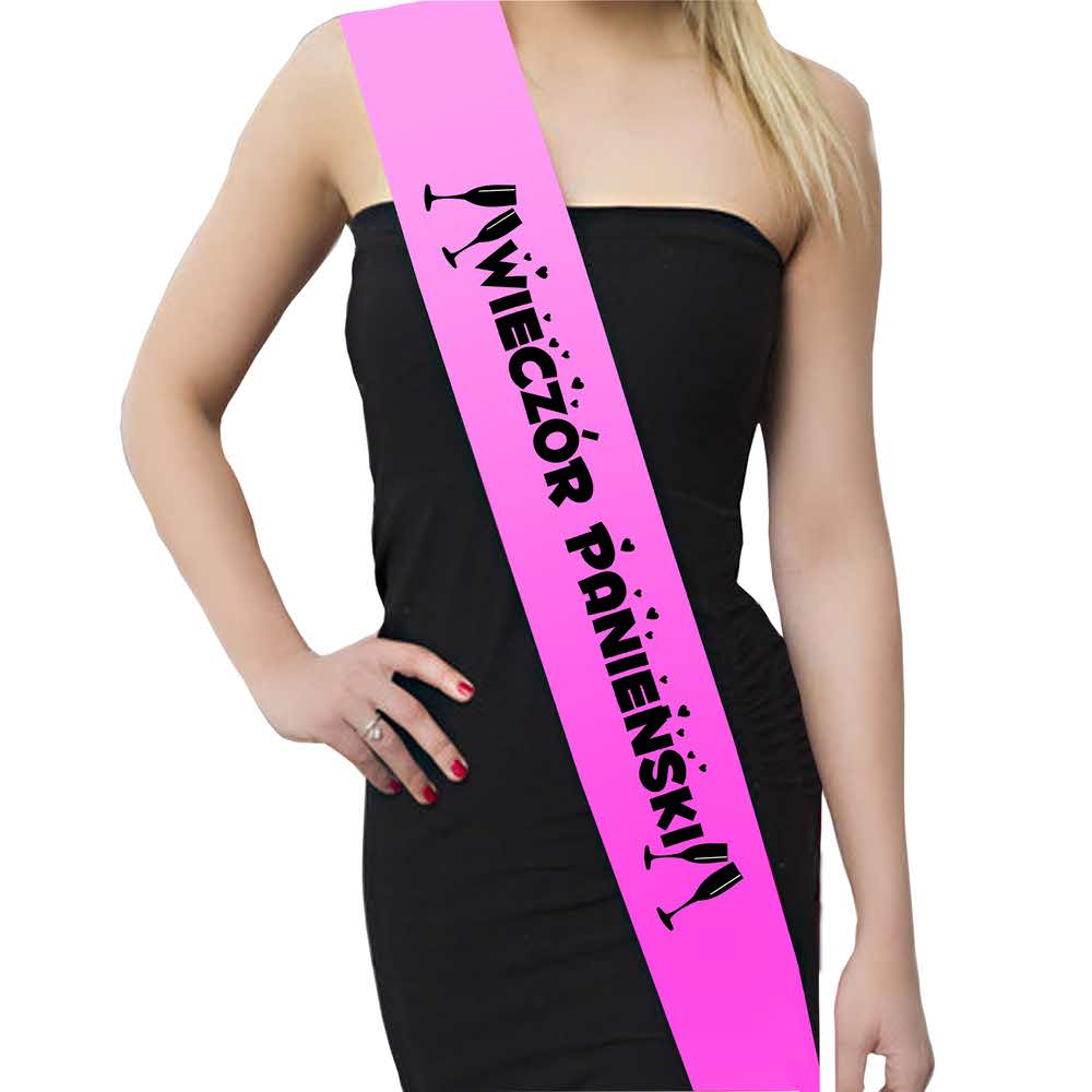 Szarfa satynowa na wieczór panieński z napisem 'WIECZÓR PANIEŃSKI’.