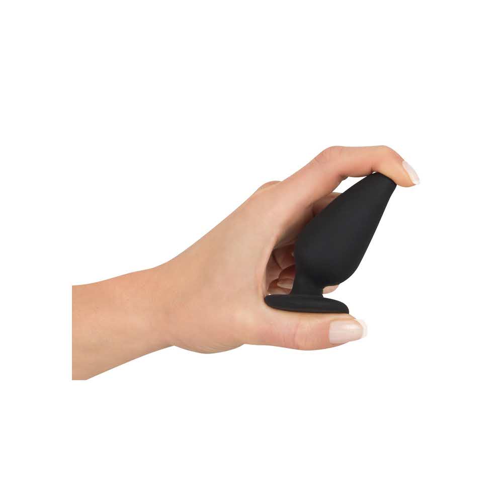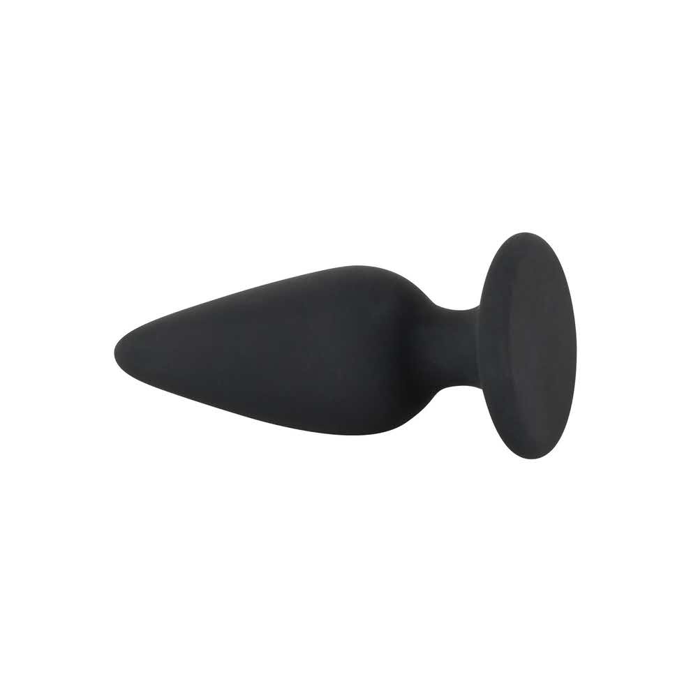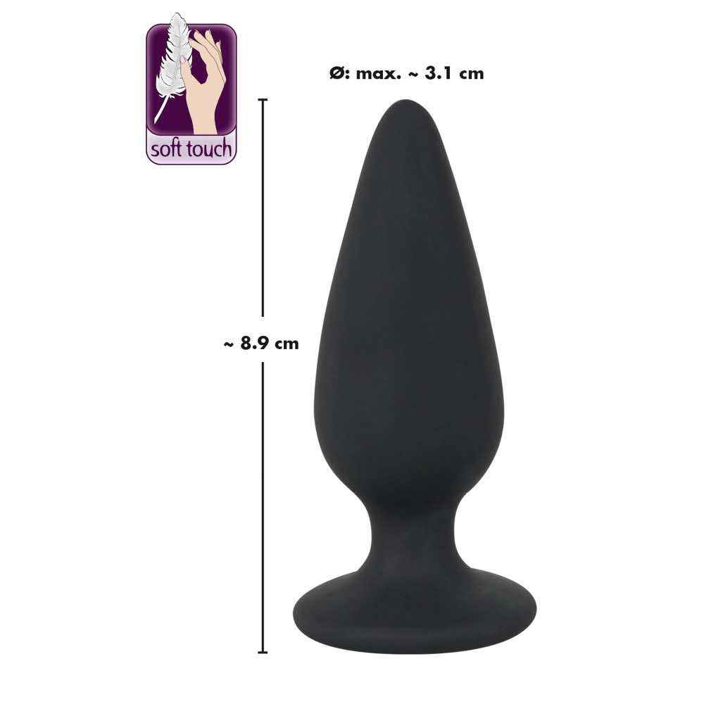 Lekko elastyczny, stożkowy korek z podstawą. Czarny. Całkowita długość 8,9 cm, głębokość zakładania 8 cm, Ø 1,3-3,1 cm, waga 75 g. Silikon z powłoką PU
