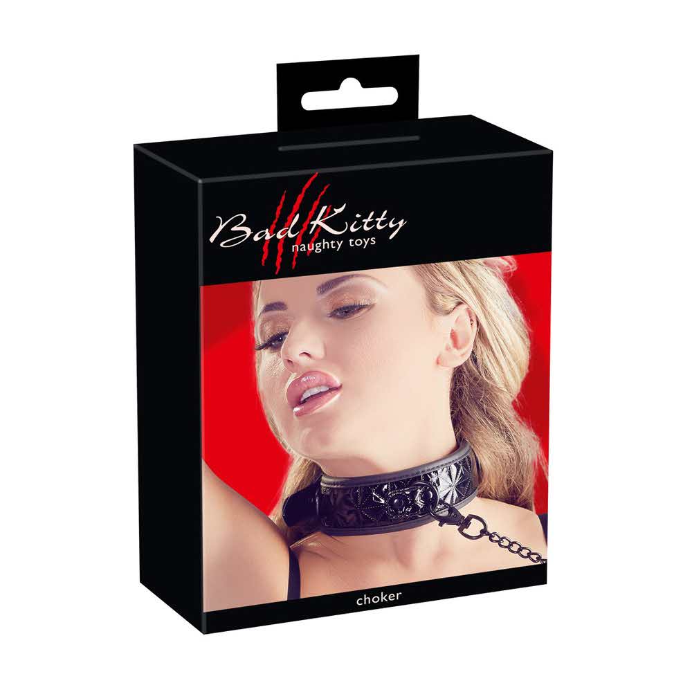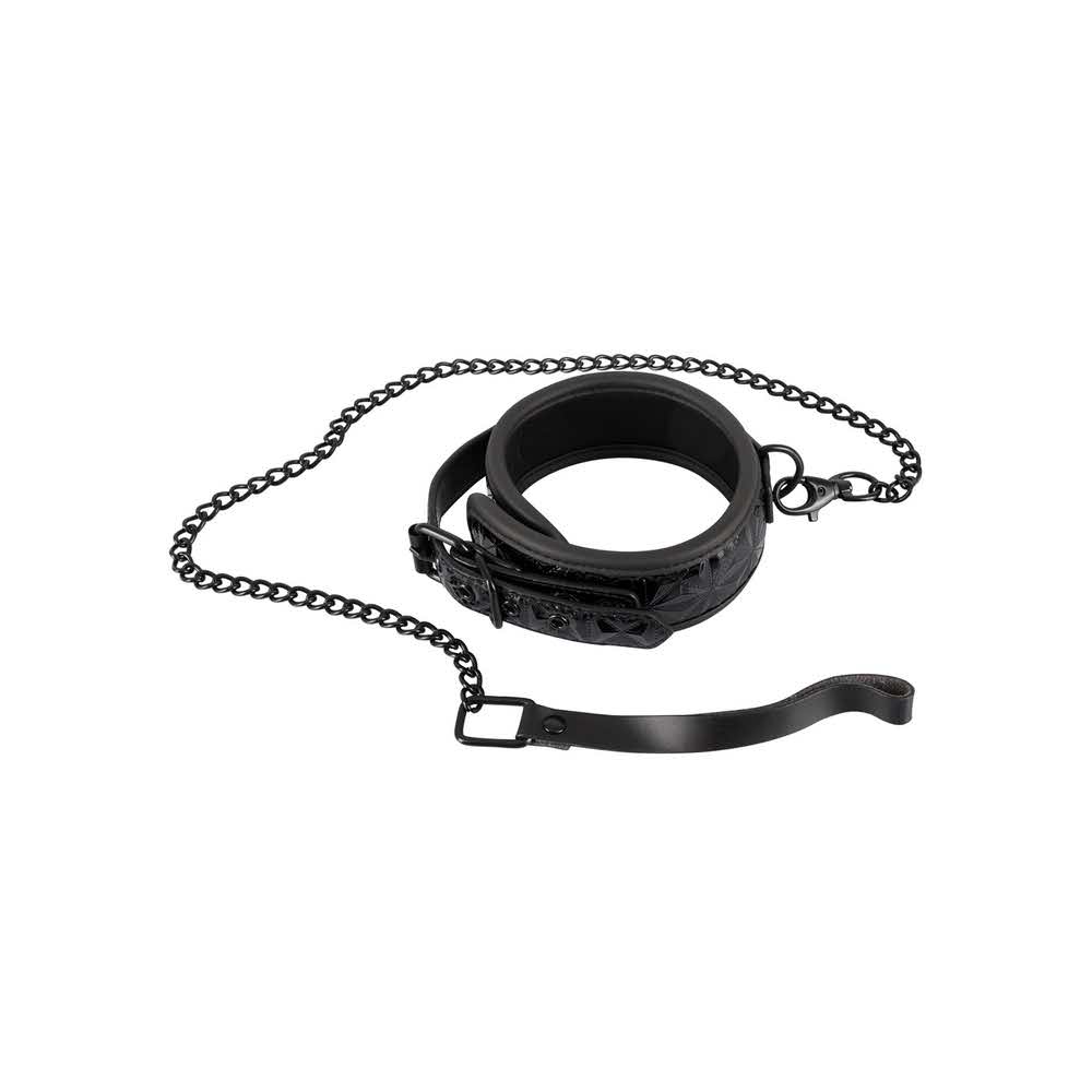Lekko wyściełana, czarna obroża z wytłoczoną powierzchnią w pięknym, diamentowym wzorze. Z zaokrąglonymi krawędziami. Zawiera matową czarną smycz z karabińczykiem i pętlą na nadgarstek (kompletna długość 88 cm). Kołnierz o szerokości 5,5 cm, obwód można regulować w zakresie od 40 do 48 cm. Materiał: poliuretan, metal, skóra, kauczuk syntetyczny, bez ftalanów zgodnie z Rozporządzeniem UE REACH.