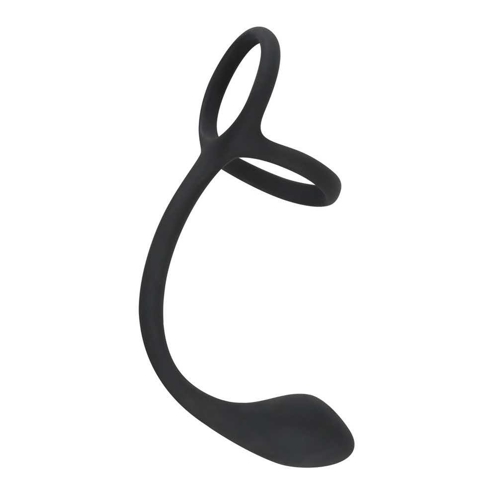 Czarna wtyczka do stymulacji prostaty za pomocą zintegrowanego pierścienia na penisa i jądra. Wtyczka ma dużą głowicę i wąski wałek, który zapewnia równoczesną stymulację krocza. Całkowita długość 22,5 cm. Wtyczka: długość 16 cm, głębokość wsadu 6 cm, Ø 0,8-2,8 cm. Pierścień na penisa i jądra: Ø 4,1 cm (elastyczny), grubość 5 mm. Silikon, bez ftalanów zgodnie z Rozporządzeniem UE REACH.