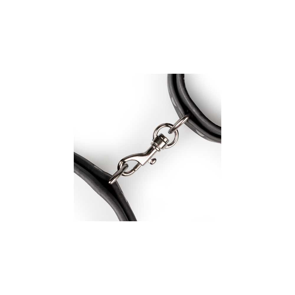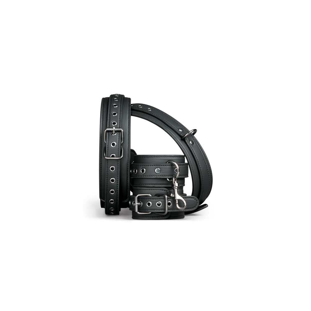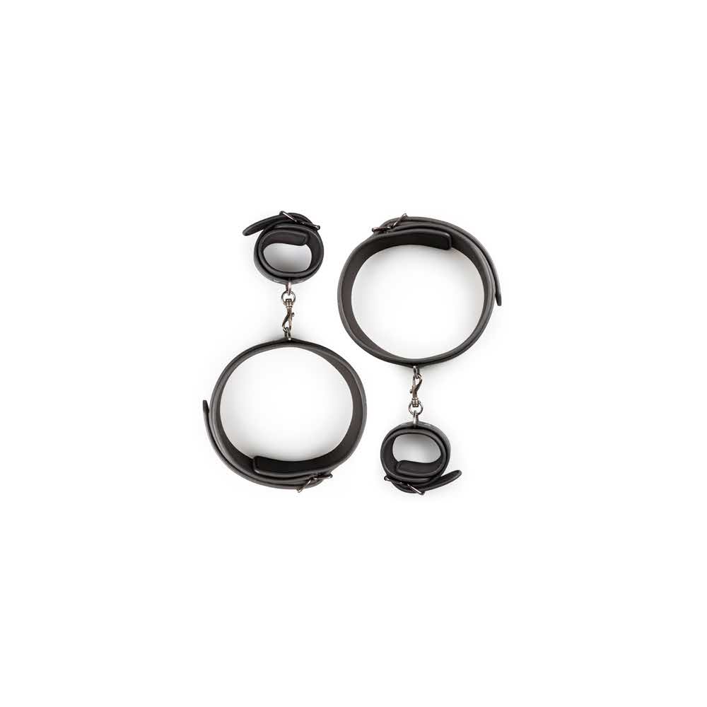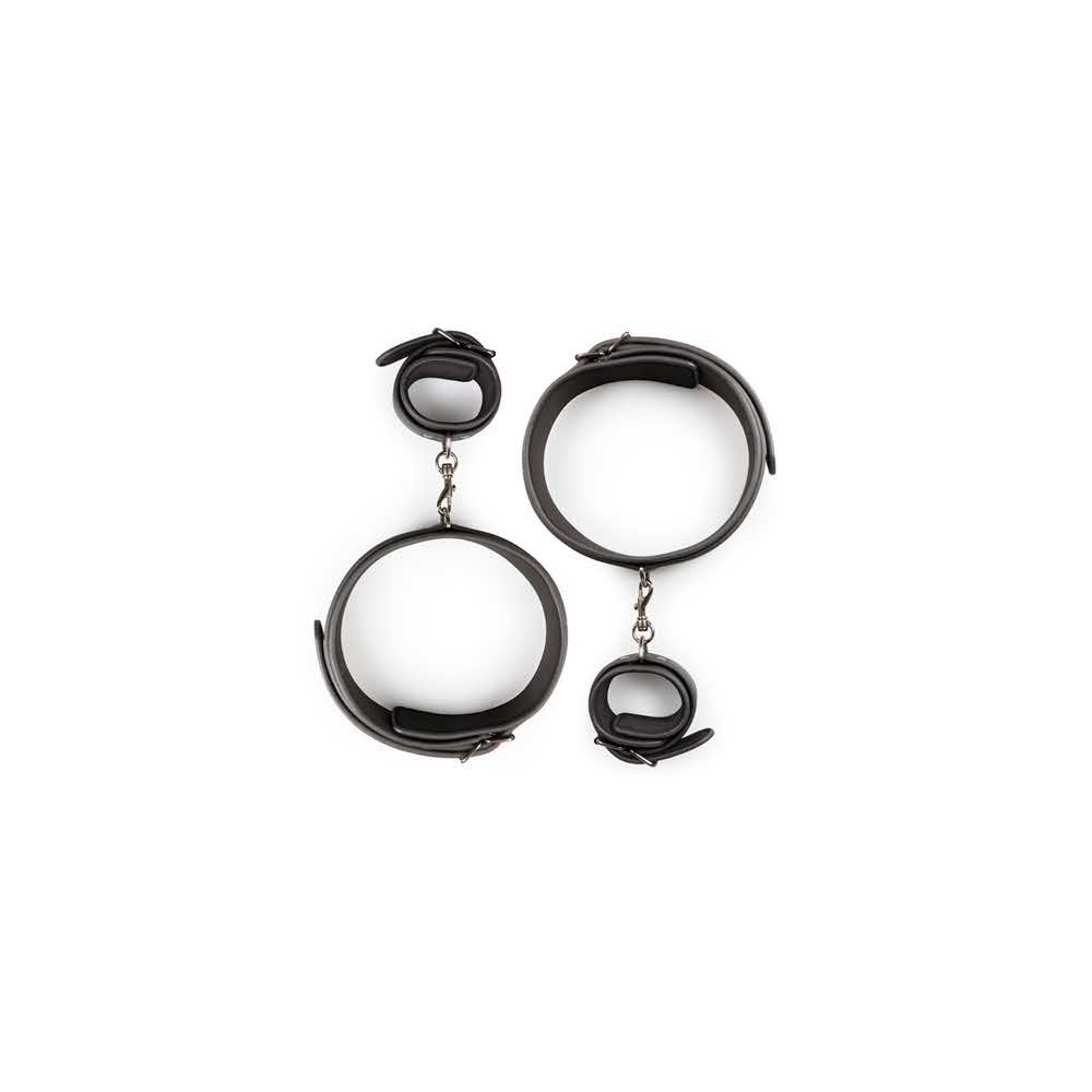 Z tym specjalnym zestawem mankietów możesz połączyć ręce podwładnego do jego ud. W ten sposób masz pełną kontrolę nad przyjemnym doświadczeniem BDSM. Mankiety wykonane są z mocnej i wytrzymałej skóry ekologicznej i są wyłożone pianką, aby zapobiec zarysowaniu. Kajdany są przymocowane do mankietów na udach za pomocą klamer. Oznacza to, że można również odpiąć mankiety i używać ich oddzielnie lub w połączeniu z innymi zabawkami BDSM. Wszystkie cztery mankiety są łatwo regulowane, co zapewnia idealne dopasowanie i wygodne użytkowanie.