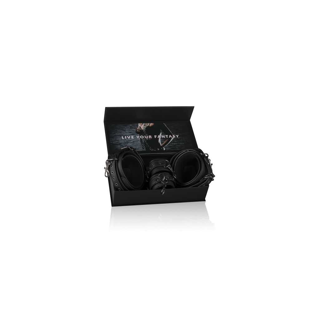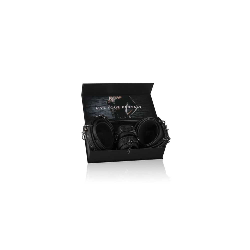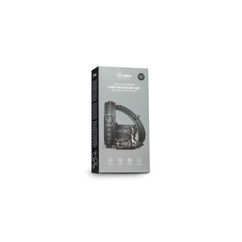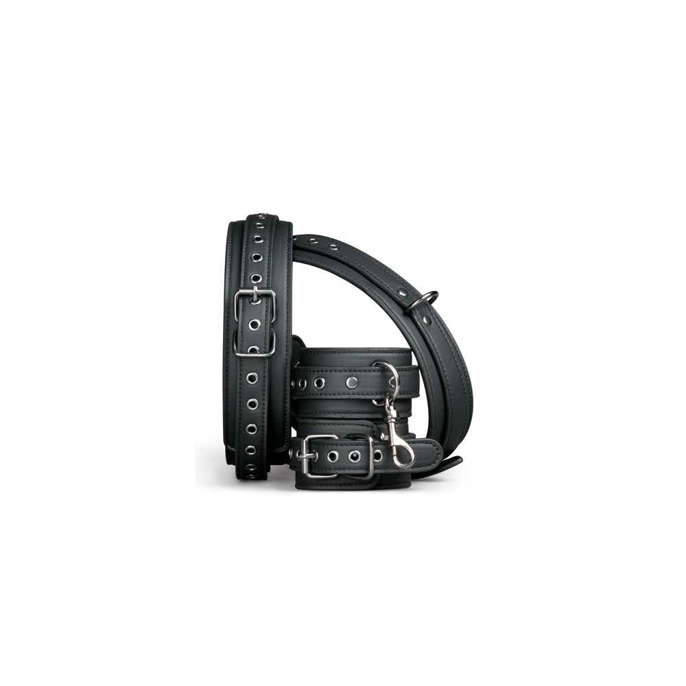 Z tym specjalnym zestawem mankietów możesz połączyć ręce podwładnego do jego ud. W ten sposób masz pełną kontrolę nad przyjemnym doświadczeniem BDSM. Mankiety wykonane są z mocnej i wytrzymałej skóry ekologicznej i są wyłożone pianką, aby zapobiec zarysowaniu. Kajdany są przymocowane do mankietów na udach za pomocą klamer. Oznacza to, że można również odpiąć mankiety i używać ich oddzielnie lub w połączeniu z innymi zabawkami BDSM. Wszystkie cztery mankiety są łatwo regulowane, co zapewnia idealne dopasowanie i wygodne użytkowanie.