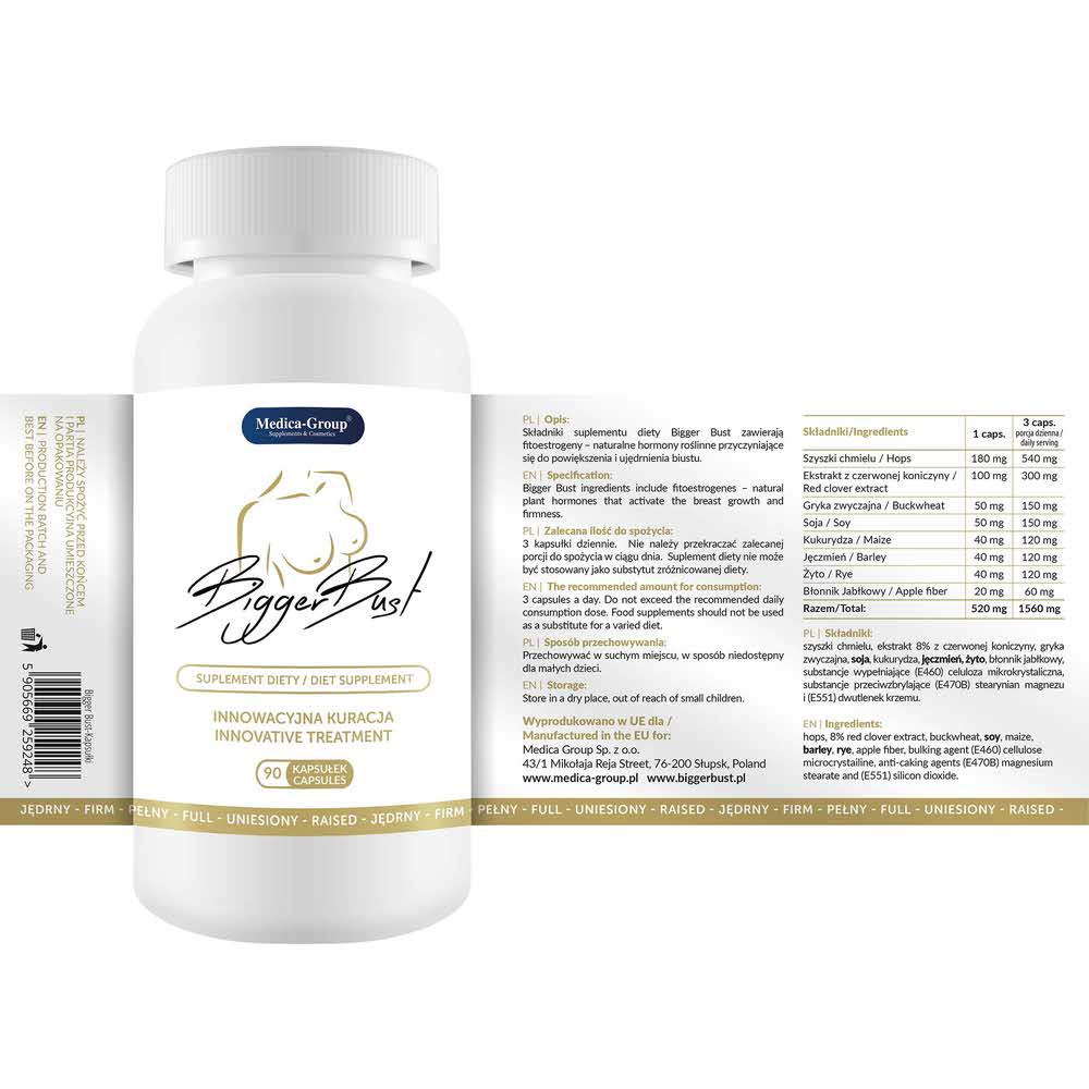 Suplement diety Bigger Bust zawiera składniki aktywne na bazie fitoestrogenów mających na celu powiększenie i ujędrnienie biustu.