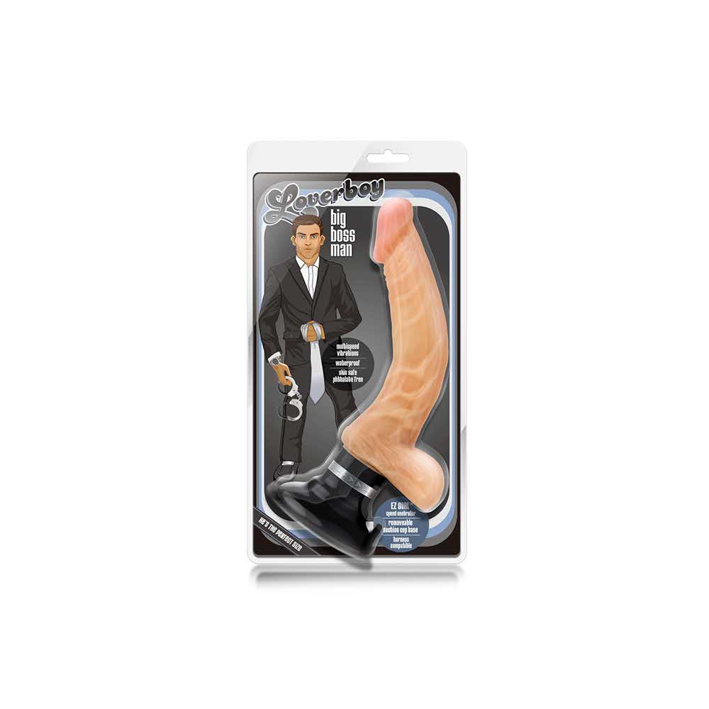 The Boss Man is large and in charge with 7 inches of insertable length and 1.5 inches of girth. Stimulate your g-spot with this large and perfectly curved realistic dildo. The strong suction cup makes this dildo perfect to be mounted anywhere for your play! This base also makes this toy harness compatible for both lesbian play or pegging. This dildo is made of phthalate free PVC. He has realistic texture and over 2 inches of girth. This dildo features a suction cup base that sticks to any smooth flat surface and is harness compatible.Power – Deep rumbly vibrations. EZ dial integrated controller offers easy to access multiple adjustable speed settingsPerfect – Sized perfectly for big toy loversVersatile – The suction cup base will stick to almost any smooth flat non-porous surface and is harness compatible Peace of mind – Made of body safe non-porous PVC. Contains no synthetic fragrance, phthalate, paraffins or latex. It meets or exceeds international product safety standards.Length 10.5 inch / 26,6 cmInsertable length 7 inch / 17,7 cmWidth 1.5 inch / 3,8 cm