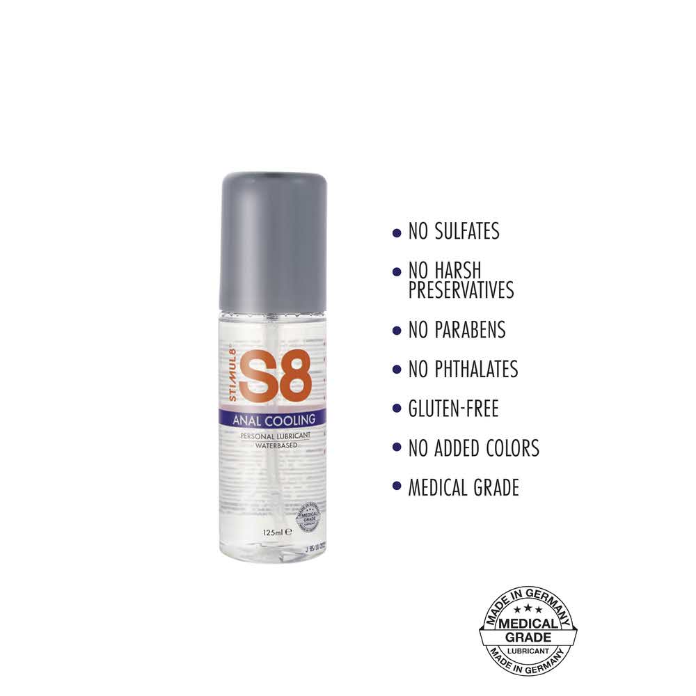 The premium S8 Waterbase Anal Cooling lubricant offers an indulgent, long-lasting glide; perfect for naughty backdoor adventures! This amazing, long-lasting formula by S8 is completely paraben-free, phthalate-free, gluten-free, sulfate-free, plus contains no added colors or harsh preservatives for an irresistible ‘natural’ appeal. When applied, the S8 Waterbase Anal Cooling lubricant has a gentle cooling effect on the skin, adding a pleasurable tingling sensation right where you want it!