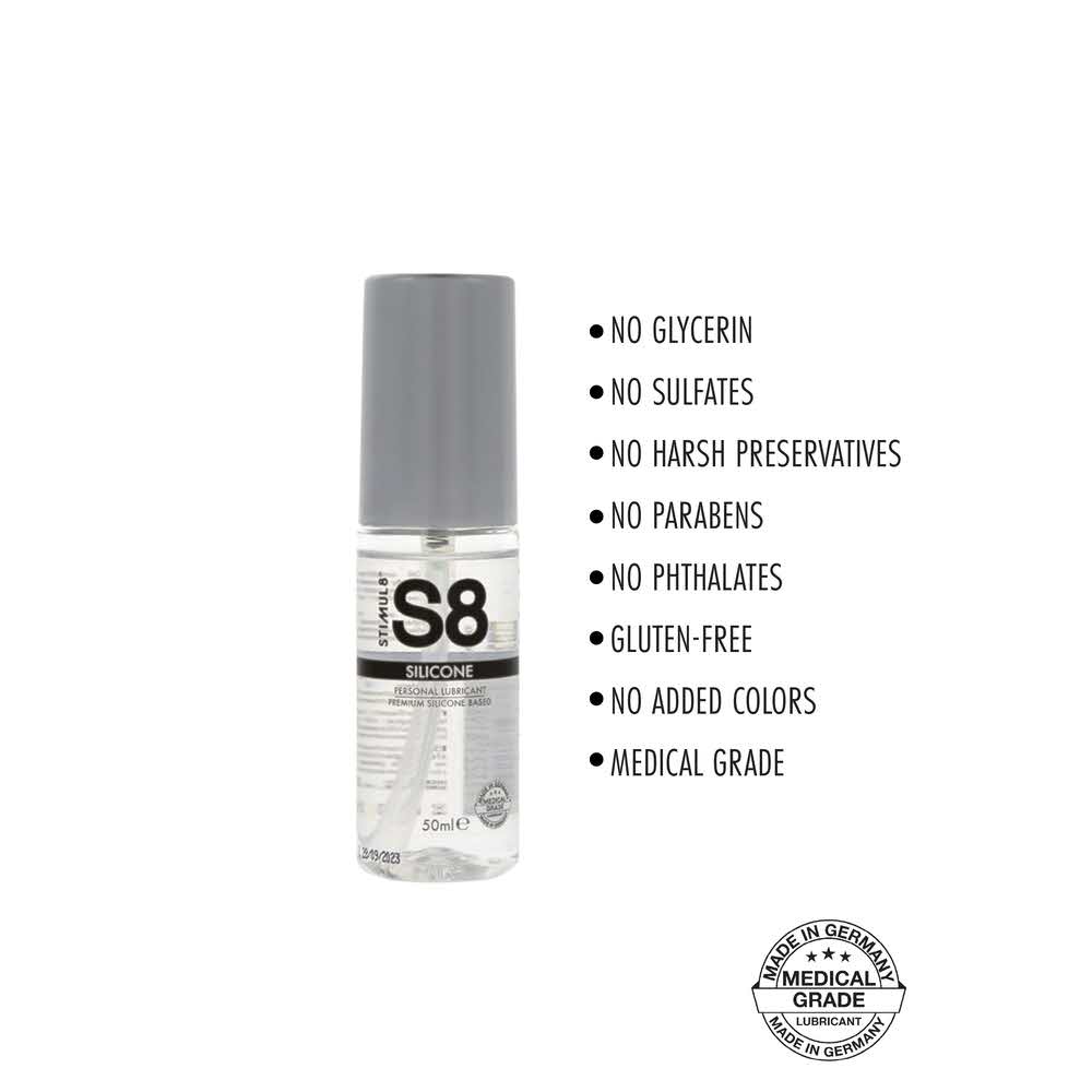 The premium S8 Silicone Premium Original lubricant offers an indulgent, long-lasting glide with a silky-smooth appeal. The unique silicone-based formula is developed to ensure the softest touch, whilst being gentle on the skin and intimate membranes. This quality lube is glycerin-free, sulfate-free, paraben-free, phthalate-free and contains no harsh preservatives or added colors. With medical-grade approval, the S8 Silicone Premium Original Lubricant also adheres to all current EU-regulations regarding intimate care products and makes a trustworthy, competitive-priced and transparent alternative to other, non-approved choices on the market.