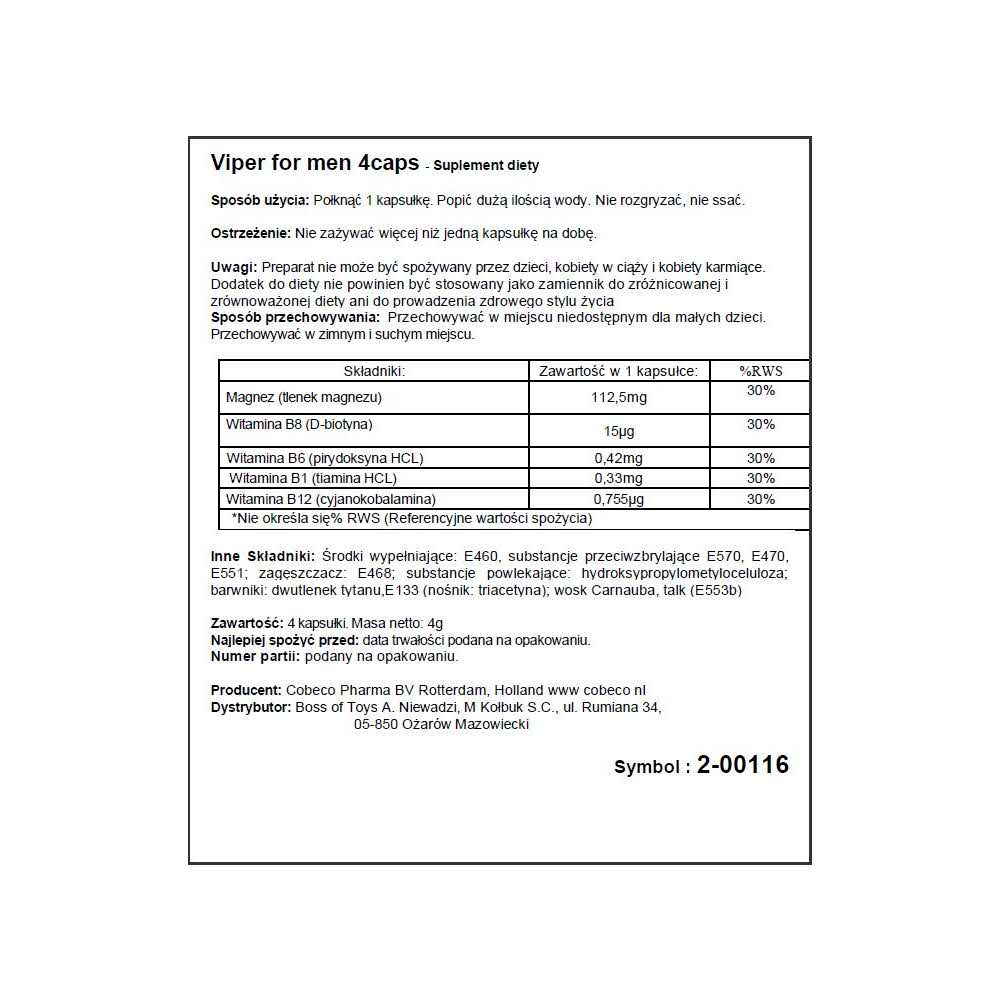 Viper to wyjątkowy suplement diety zawierający witaminy i magnez. Ma to pozytywny wpływ na zdrowe funkcjonowanie układu nerwowego, sprawność i psychiczne samopoczucie, co dobrze wpływa na libido i wspiera erekcję.