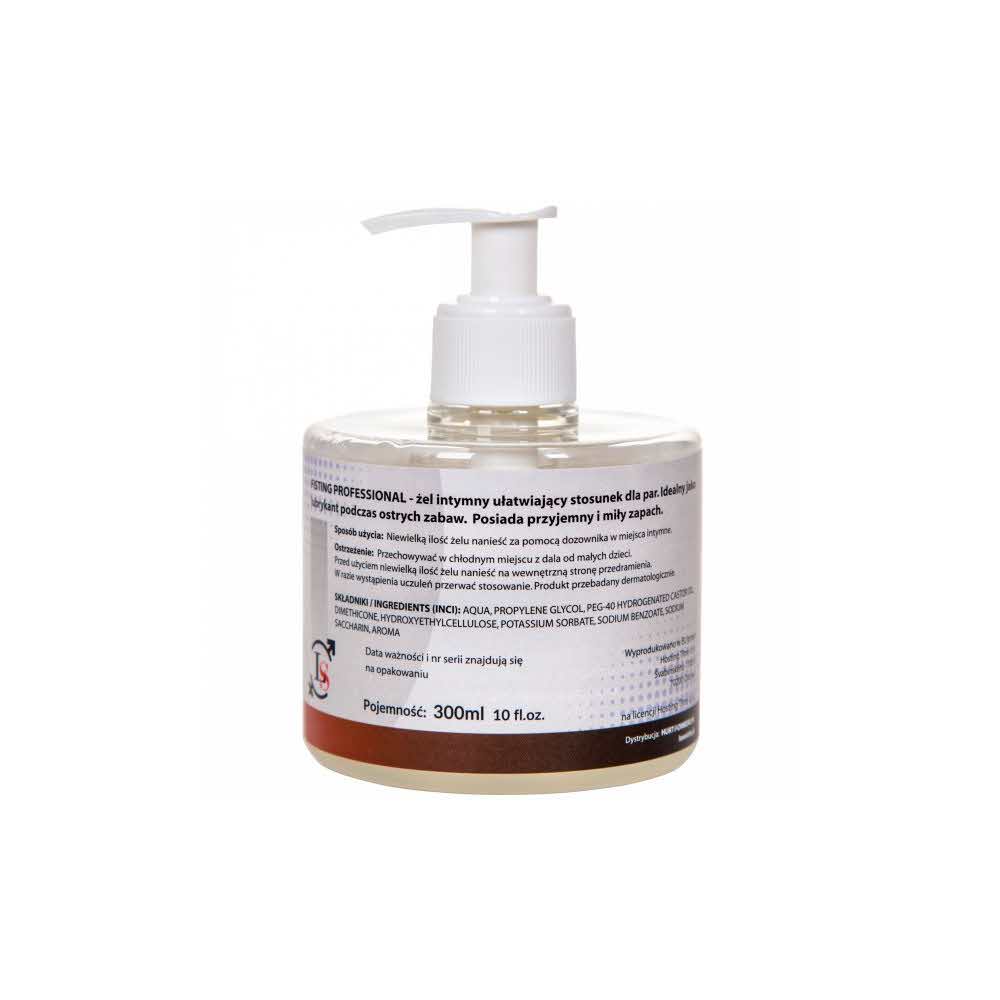 FISTING PROFFESIONAL jest profesjonalnym żelem ułatwiającym ostre zabawy z dużymi przedmiotami. Jego skład został opracowany tak by tworzyć komfort maksymalnego bezpieczeństwa oraz ekstremalnego poślizgu. Tak by użytkownik mógł skupić się wyłącznie na przyjemności zdobywania kolejnego celu, nie obawiając się o otarcia.