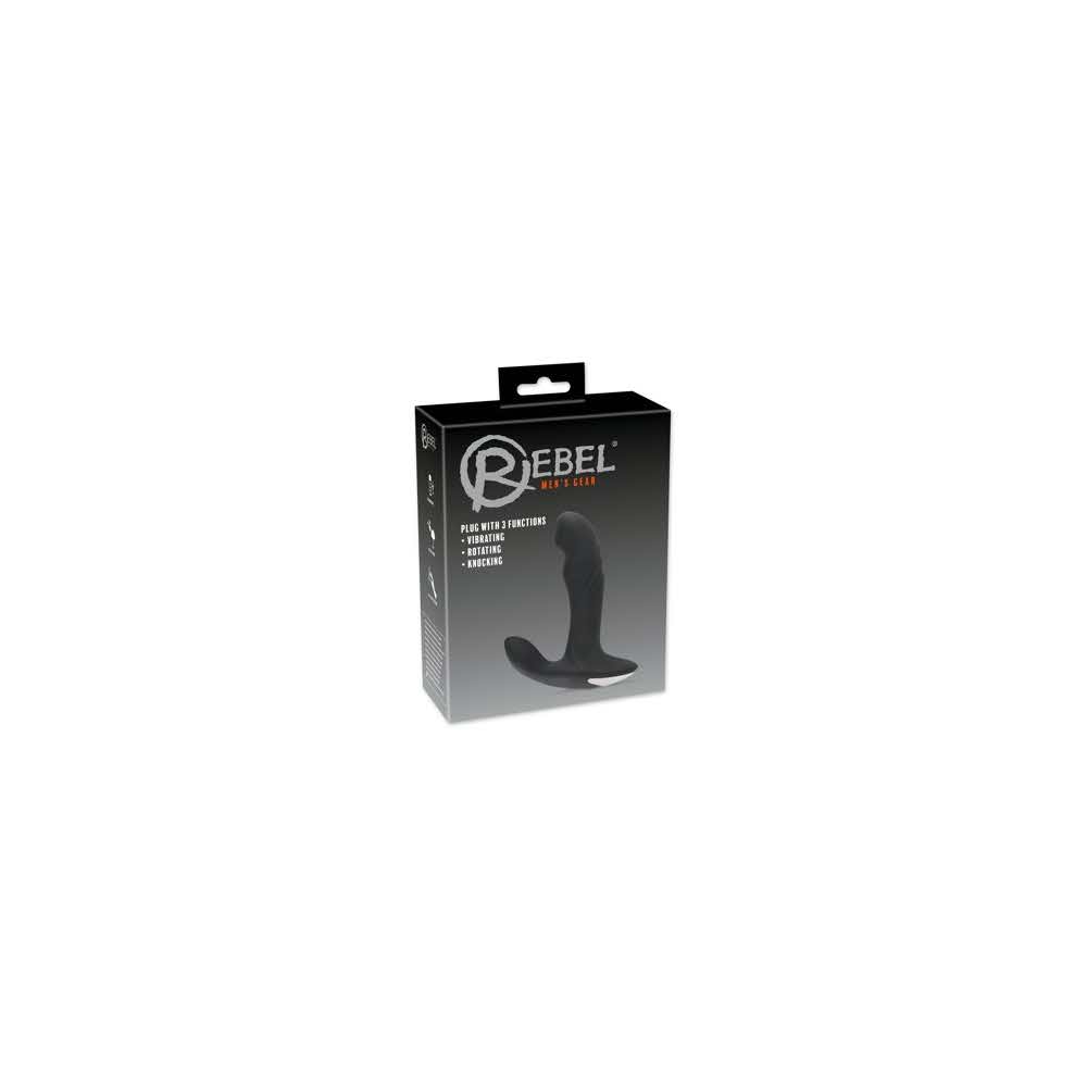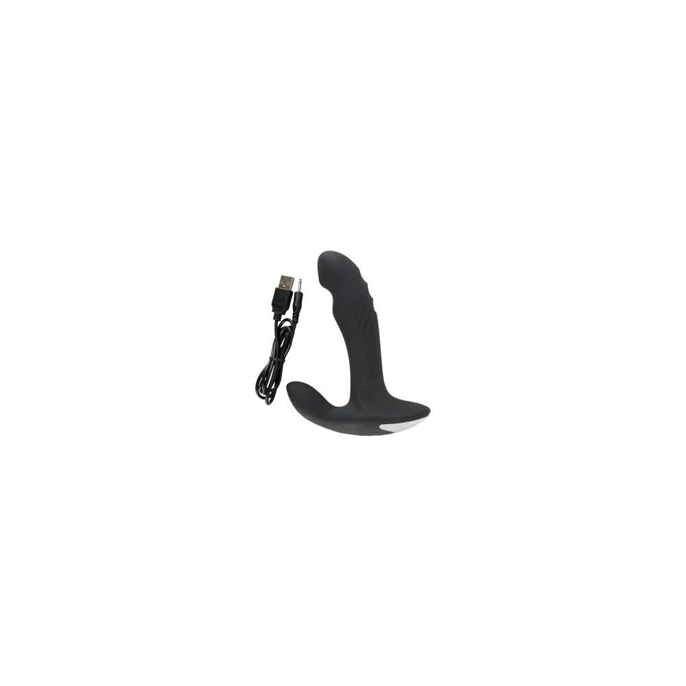 Stymuluje prostatę. Ta czarna zatyczka ze stymulatorem, rowkowanym trzonkiem i wybrzuszeniem pod lekko zakrzywioną końcówką ma 3 ekscytujące funkcje, które można kontrolować oddzielnie: ma 7 trybów wibracji w stymulatorze, 5 trybów „stukania” na końcu i 5 tryby obrotu u dołu szybu.Możliwość ładowania za pomocą dołączonego kabla USB.Całkowita długość 16,6 cm, głębokość wstawienia 13,5 cm, Ø 2,4-3,4 cm, stymulator krocza o długości 5 cm, max. 2,6 cm szerokości. Silikon z powłoką PU, ABS.