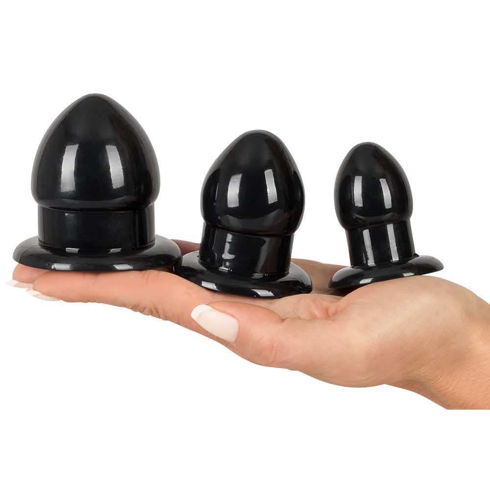Trzy błyszczące czarne korek analny / zestaw, każdy ze stojakiem / korkiem. Zacznij od małej wtyczki analnej (długość całkowita 5,2 cm) i ciesz się głębokością wstawiania 4,5 cm przy max. Średnica 3 cm w tylnym wejściu i wzrost dzięki środkowej zatyczce (długość całkowita 5,7 cm) i głębokości wkładania 5 cm o średnicy max. 3,9 cm. A jeśli chcesz jeszcze bardziej zwiększyć przyjemność z odbytu, złap największą zatyczkę (długość całkowita 6,2 cm) z głębokością wkładania 5,7 cm i dostojną średnicą max. 4,9 cm.