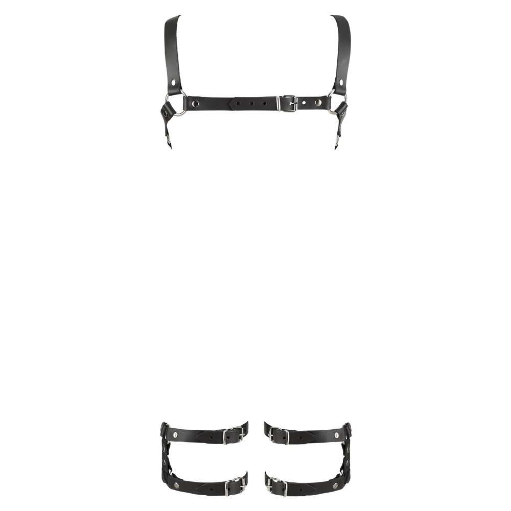 Idealny do gorących zabaw w bondage! Szelki na klatce piersiowej z odpinanymi mankietami na udach otwierają się za pomocą prostego zapięcia karabińczykowego. Skóra dwoinowa (bydlęca) garbowana bezchromowo, metal (chromowany).