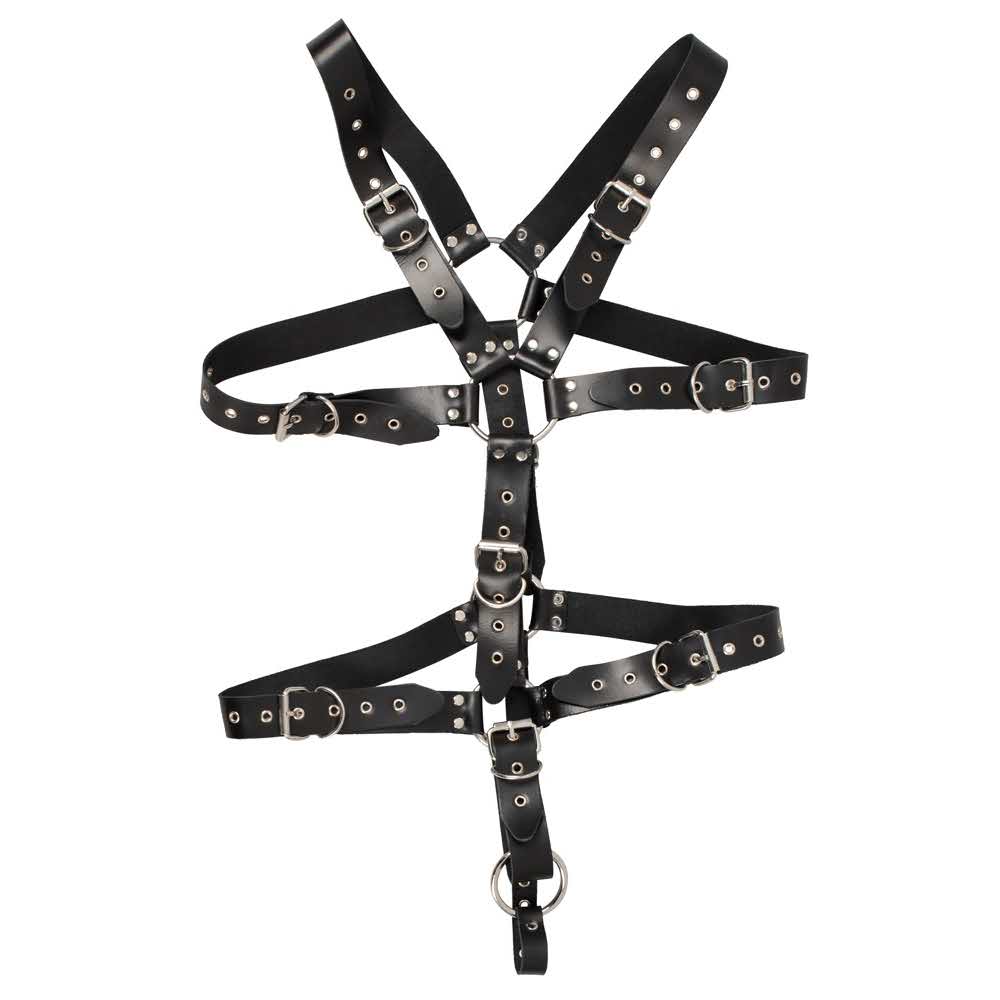 Dla miłośników skóry! Uprząż wykonana z czarnych, ćwiekowanych pasków skórzanych i stalowych pierścieni łączących. Wielokrotna regulacja za pomocą sprzączek umożliwia indywidualne dopasowanie. Pierścień na penisa lub jądra (średnica 5 cm) dodatkowo trzyma HIM w ryzach. Wysoka jakość, trwała jakość! Skóra (skóra naturalna, bawola) garbowana bezchromowo, metal. Zawiera nietekstylne części pochodzenia zwierzęcego.