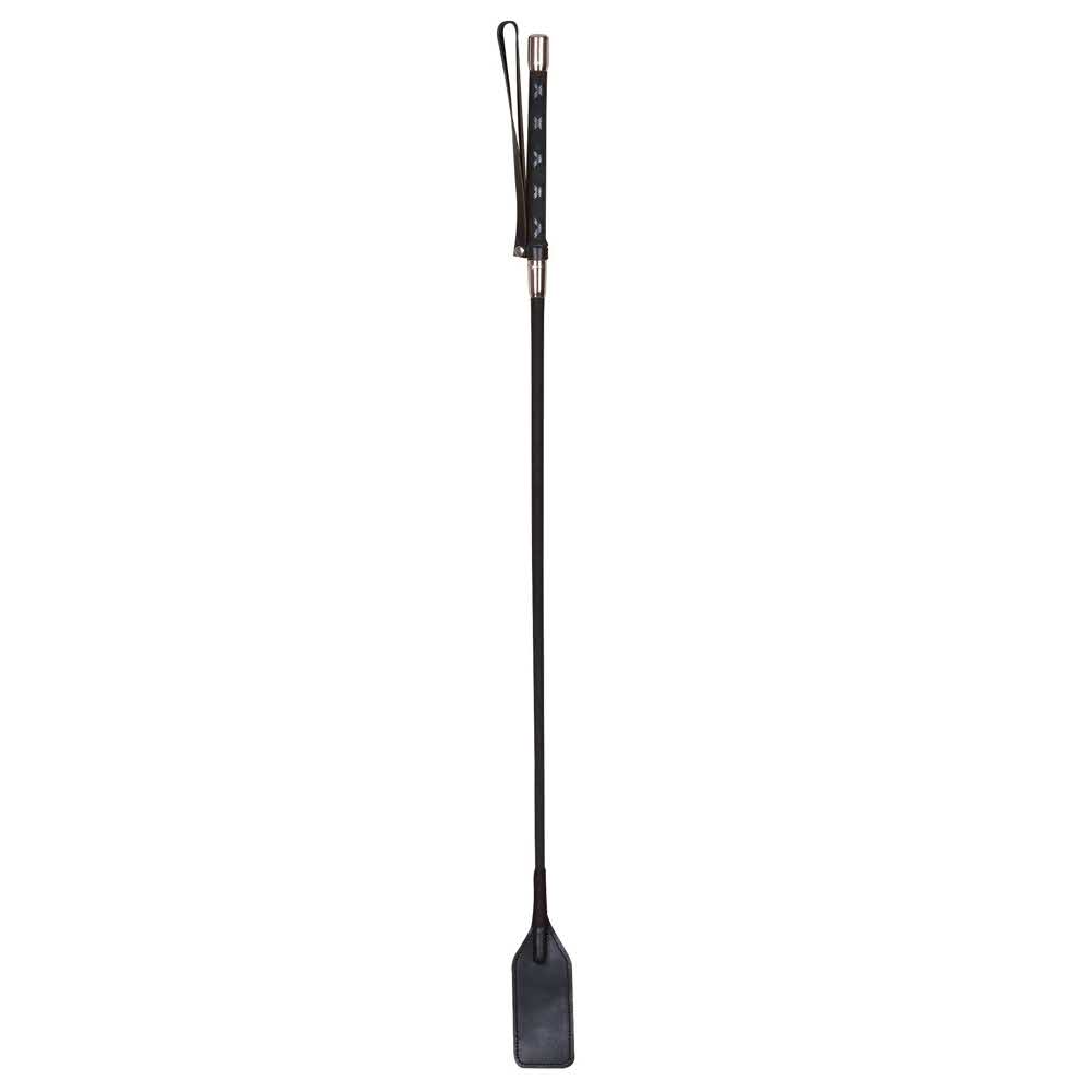 Uderzające akcesorium! Pleciony crop z końcówką skórzaną. Rękojeść w szlachetnej optyce z pętlą do trzymania. Długość całkowita ok. 69 cm. Skóra (garbowana bezchromowo), sztyft: polichlorek winylu, poliester. Zawiera nietekstylne składniki pochodzenia zwierzęcego.