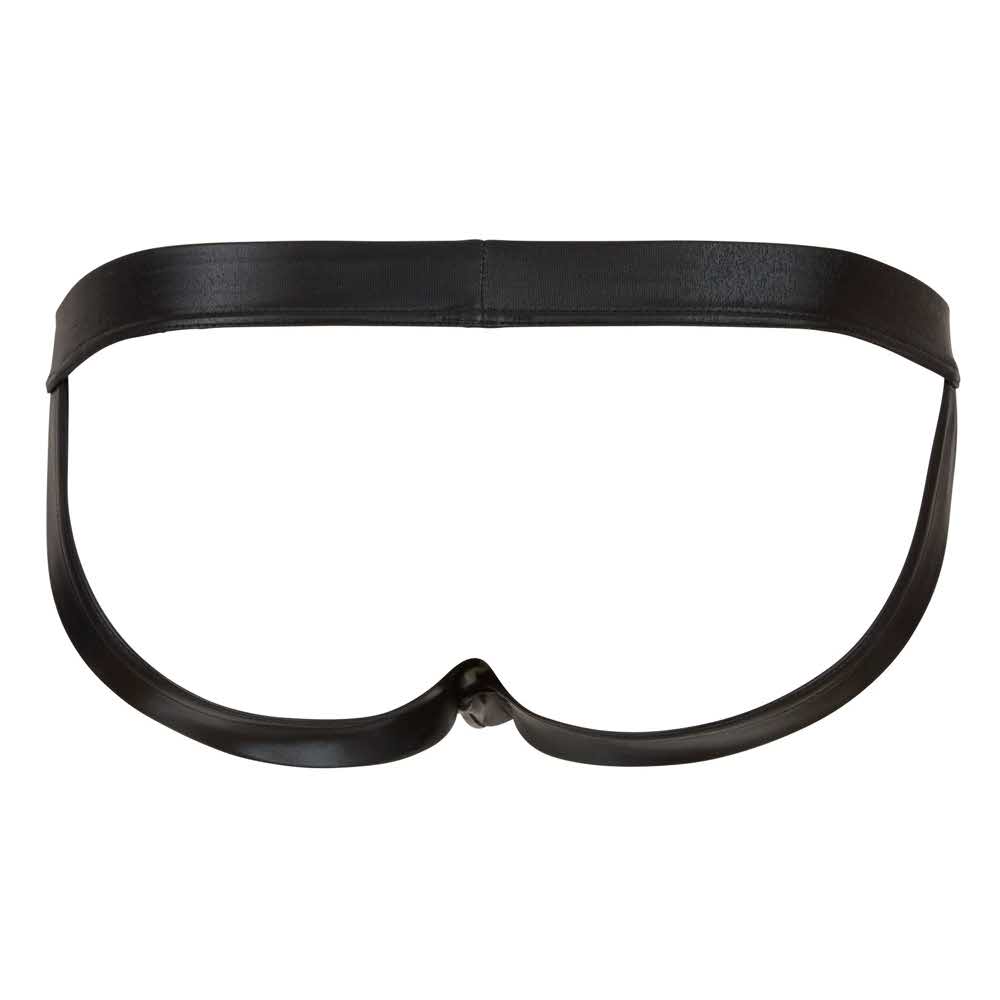 Stretchy, shiny black jock. Waistband and jockstraps are covered in material. 92% polyester, 8% spandex.
