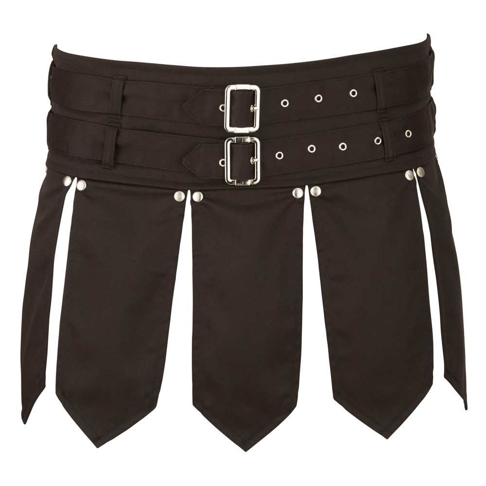 Gladiatorzy uważajcie! Czarna spódnica w stylu gladiatorki z dwoma paskami. Rozciągnij się z tyłu. 60% poliester, 35% bawełna, 5% spandex.
