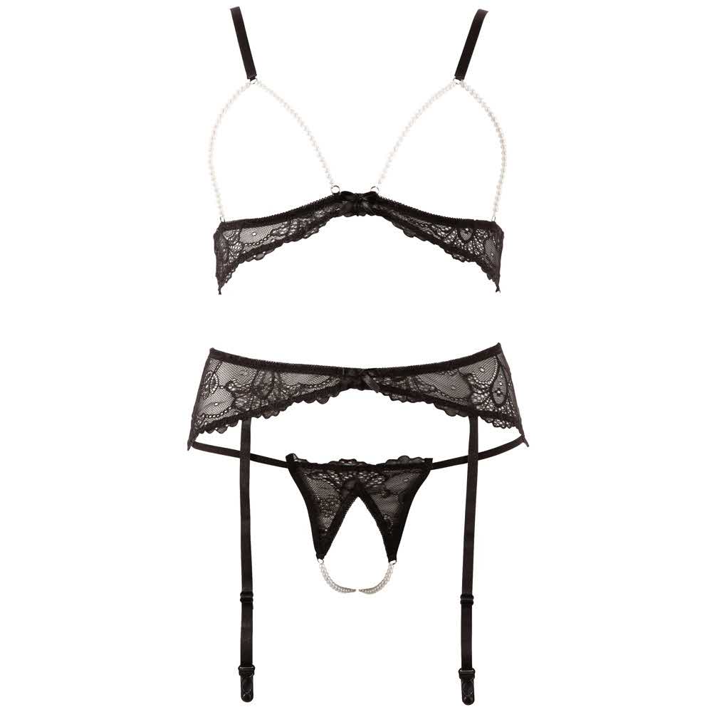 Black lace set consisting of a wireless bra and crotchless string with decorative pearls and suspender belt. Suspender and straps adjustable. 90% polyamide, 10% spandex.
