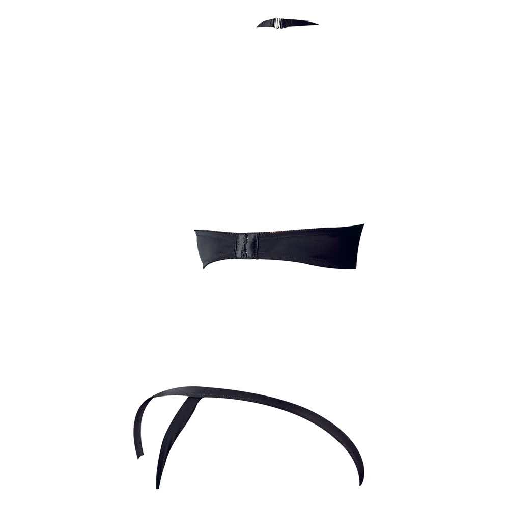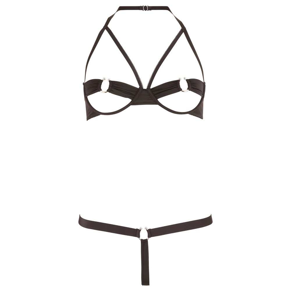 Czysta uwodzicielskość! Ten zestaw nie pozostawia żadnych fantazji niespełnionych! Biustonosz z fiszbinami zachwyca całkowicie otwartymi miseczkami oraz metalowymi pierścieniami w kształcie podkówek na sutkach. Z tyłu praktyczne zapięcie na haftkę, a modny półokrągły dekolt można wygodnie rozpiąć za pomocą zatrzasku. Nie do pogardzenia są również ostre stringi z elastycznym paskiem i metalowym pierścieniem z przodu, ponieważ przez krocze prowadzi tylko miękka opaska. Dzięki tym uroczym widokom Twój ulubieniec nie będzie mógł długo utrzymać palców w miejscu… 85% poliamid, 15% spandex.