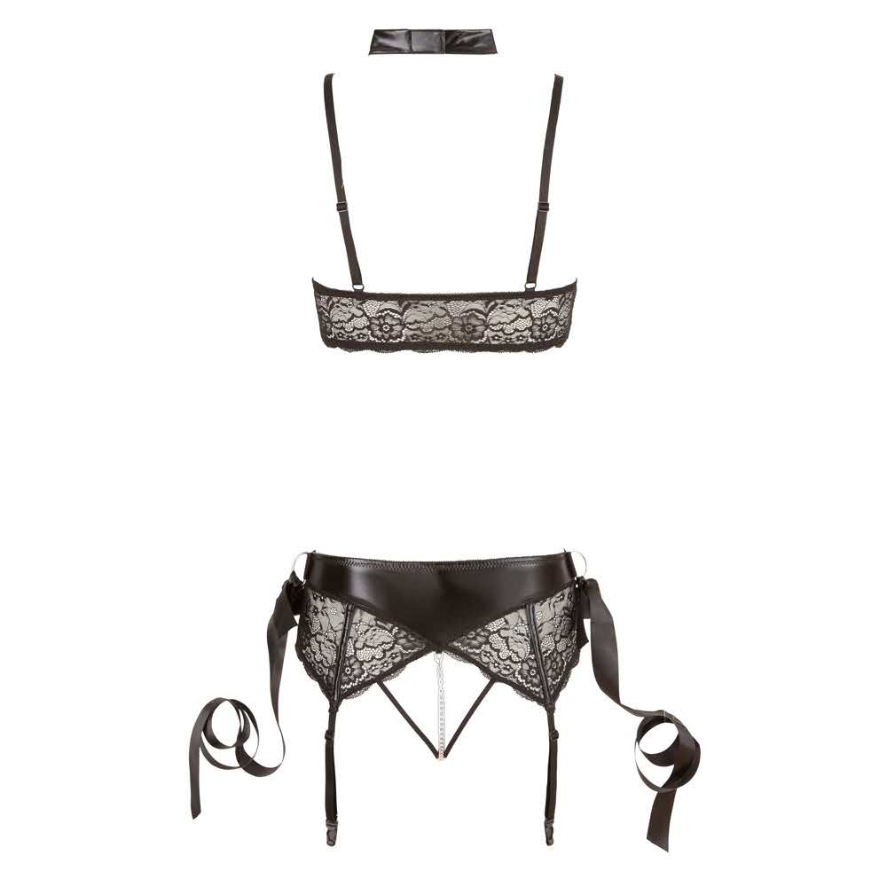 Urzekający erotyzm! Szlachetny biustonosz ouvert z szeroką koronkową talią i regulowanymi ramiączkami. Z paskami, odpinanymi łańcuchami i kołnierzem z zapięciem na rzepy dla zapierającego dech w piersiach dekoltu. Linka ouvert wabi kolejnym łańcuszkiem przez krocze. Mons pubis jest również oprawiony w 2 gumki. Z regulowanymi szelkami oraz pierścionkiem i satynowymi wstążkami do wiązania po każdej stronie bioder. Idealny do dzikich zabaw na ciemnej łące pożądania. 92% poliester, 8% elastan koronka 90% poliamid, 10% elastan.