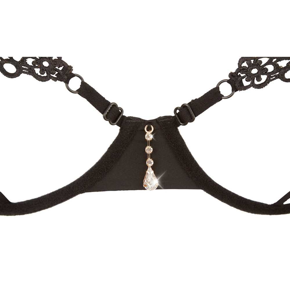 Minimalna bielizna dla maksymalnego efektu! Biustonosz z otwartymi miseczkami składa się tylko z fiszbin i tasiemek, dzięki czemu pozwala spojrzeć w głąb, ponieważ sutki są zakryte tylko haftem. Z tyłu biustonosz zapinany jest na haftki, a ramiączka mają regulowaną długość. Pasujące do nich stringi są zachęcająco pozbawione krocza i również posiadają z przodu szlachetny haft, który połączony jest z tasiemkami za pomocą trzech małych srebrnych kółeczek. Materiał główny 95% poliester, 5% elastan haft/ koronka 100% poliester stringi 100% poliester.
