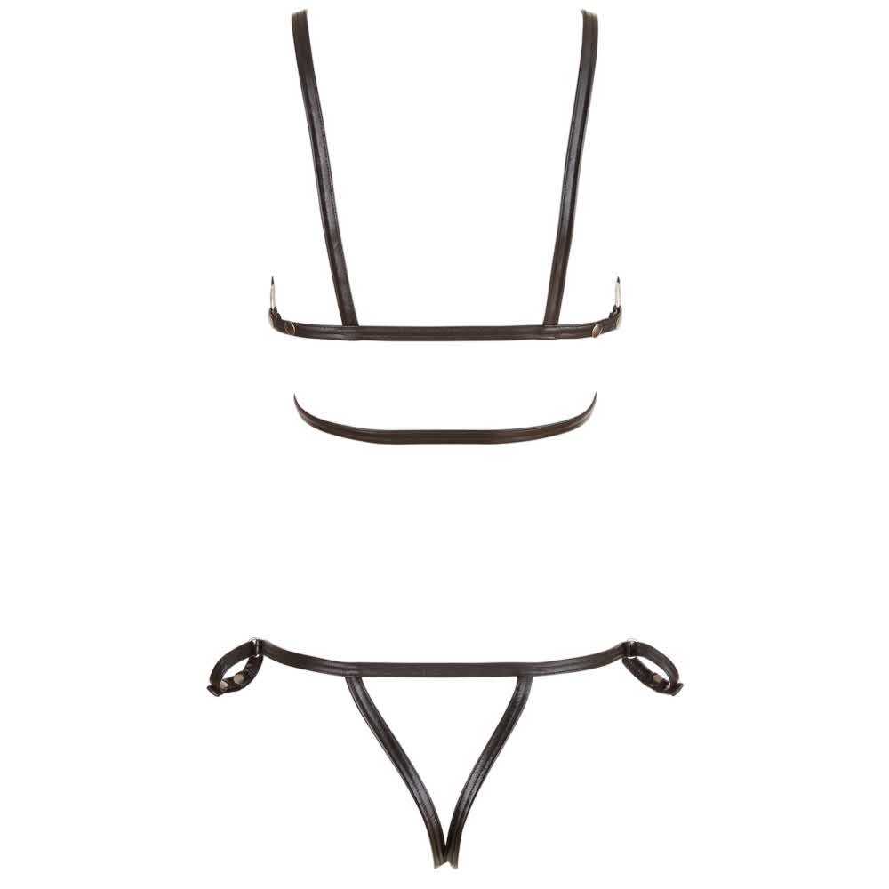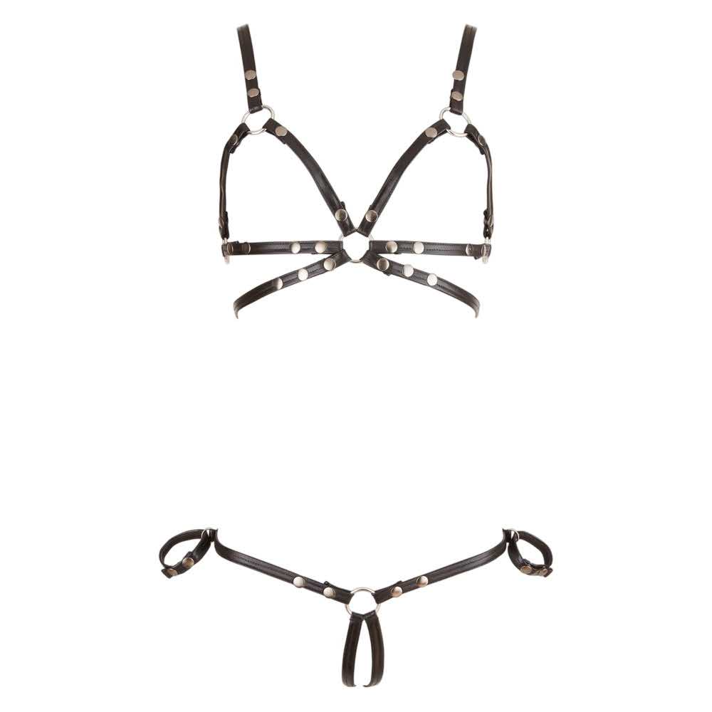 Dla szczególnie odważnych! Uprząż ta nie jest dla osób nieśmiałych, gdyż składa się wyłącznie z szytych, elastycznych pasów wetlook, które połączone są pierścieniami – zarówno biust jak i krocze są całkowicie otwarte! Góra i dół regulowane są za pomocą zatrzasków, dół posiada również boczne pierścienie, do których przymocowane są kajdanki, które również regulowane są za pomocą zatrzasków. 92% poliester, 8% spandex.