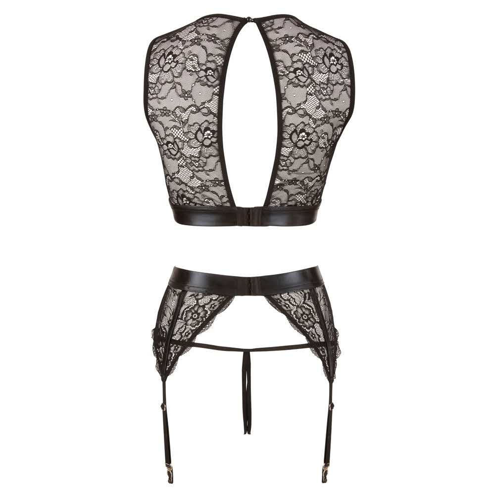 3-częściowy zestaw do prania wraz z kajdankami! Top, pasek do pończoch i sznurek w połączeniu z przezroczystą koronką i czarnym mokrym wyglądem. Chmurka to szybko otwierające się zapięcia zatrzaskowe nad biustem oraz kajdanki z zapięciem na rzepy, które można szybko zawieszać i wyjmować dzięki karabinkom na ozdobnych pierścieniach górnych i pasie do zawieszania. Tak więc zestaw bielizny szybko staje się specjalnym zestawem niewolniczym dla początkujących! Góra z tyłu z małą klamrą (przyciskiem). Uchwyt na paski regulowany. Materiał: 90% poliamid, 10% elastan wkładki typu wet look i sznurek 92% poliester, 8% elastan.