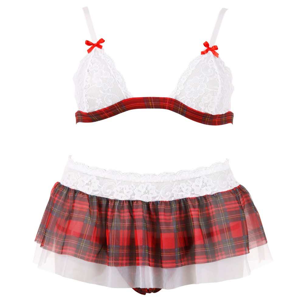 Mocna konstrukcja! Czerwona krata w połączeniu z białą koronką i tiulem. Miękki biustonosz z koronkowymi miseczkami, regulowanymi ramiączkami i zapięciem na zatrzaski z tyłu. Dopasowana dwuwarstwowa spódniczka mini z koronkowym paskiem w talii i tiulowym spodem, który wychodzi na zewnątrz. W komplecie z całkowicie otwartymi stringami. 65% poliester, 25% poliamid, 10% spandex.