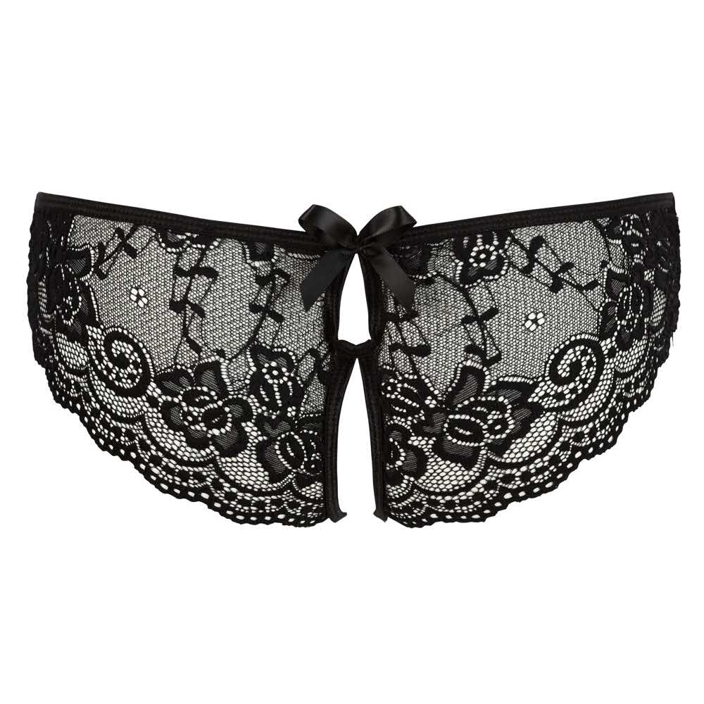 Do uwodzicielskich spostrzeżeń! Te słodkie majteczki to połączenie szlachetnej kwiatowej koronki z wycięciami ozdobionymi kokardkami z przodu i z tyłu. Krocze jest utrzymywane tylko przez 2 gumki i zapewnia bardzo erotyczny wgląd. Dzięki wysokiej zawartości spandexu majtki są przyjemnie wygodne i doskonale dopasowują się do kobiecych kształtów. 90% poliamid, 10% spandex.