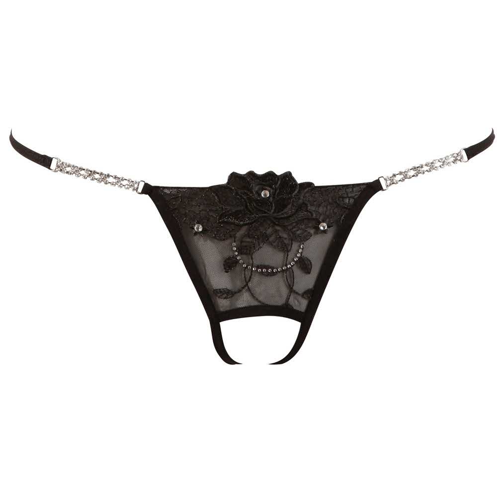 Seksowna w każdym szczególe! Skąpo wycięte stringi bez krocza z uwodzicielsko odsłoniętą częścią łonową. Z przodu z misternym haftem i detalami z dżetów, z tyłu z wyrafinowanym ozdobnym sznurowaniem nad kością ogonową. 100% poliester.