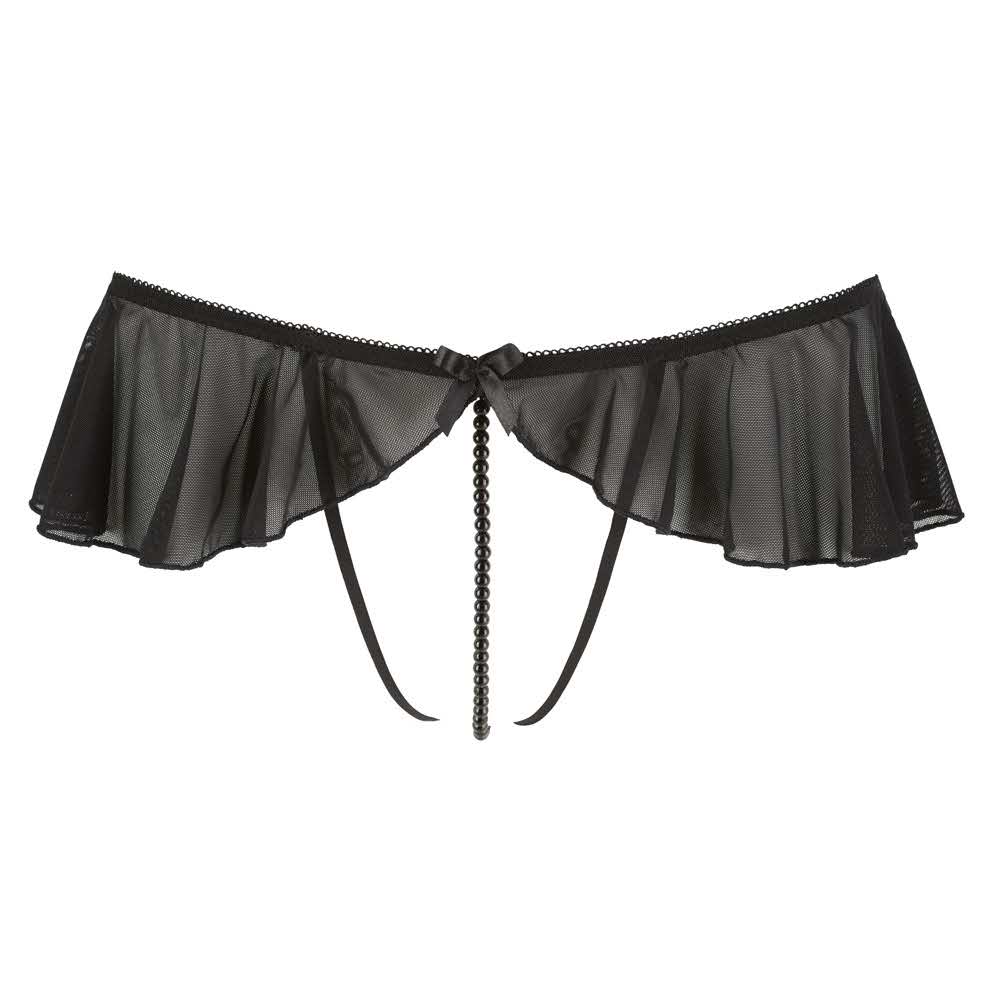 Uwodzi i stymuluje w tym samym czasie! Zmysłowe stringi ouvert z falbankami podkreślającymi figurę i czarnym perłowym naszyjnikiem przez krocze. Otwarte łono jest zmysłowo obramowane przez 2 elastyczne tasiemki. 90% poliamid, 10% spandex.