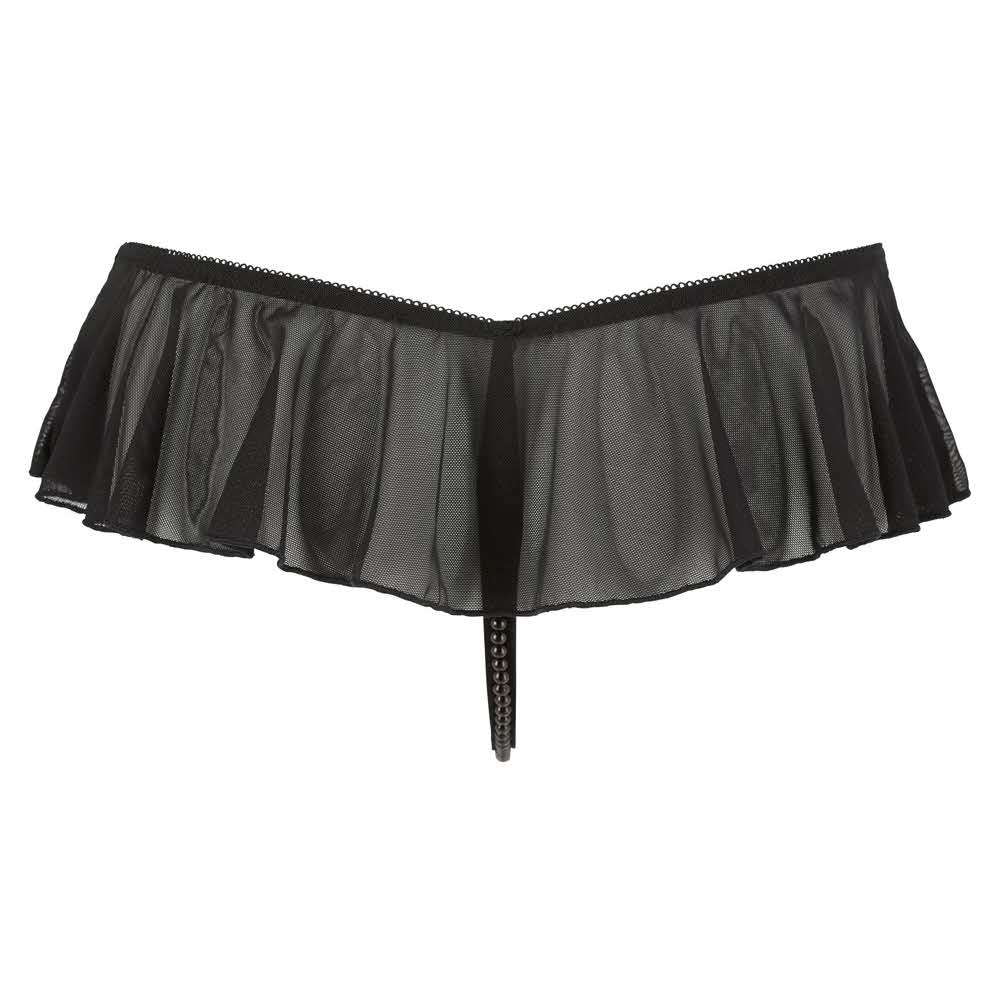 Uwodzi i stymuluje w tym samym czasie! Zmysłowe stringi ouvert z falbankami podkreślającymi figurę i czarnym perłowym naszyjnikiem przez krocze. Otwarte łono jest zmysłowo obramowane przez 2 elastyczne tasiemki. 90% poliamid, 10% spandex.