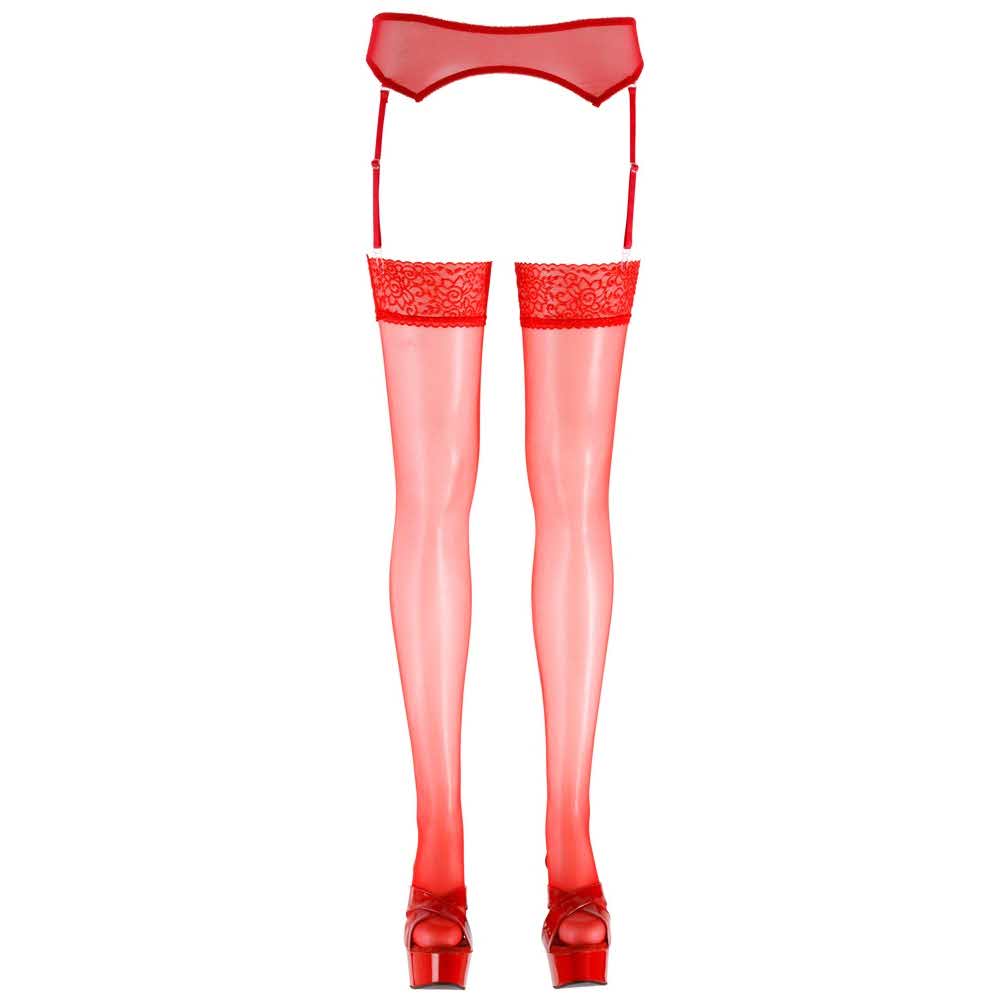 Musi być dla uwodzicielek! Jedwabiste pończochy do przypięcia na pasie do pończoch. Absolutnie przyciąga wzrok ognistą czerwienią i koronką o szerokości 7 cm. 20 den. Certyfikat Oeko-Tex. 95% poliamid, 5% elastan.