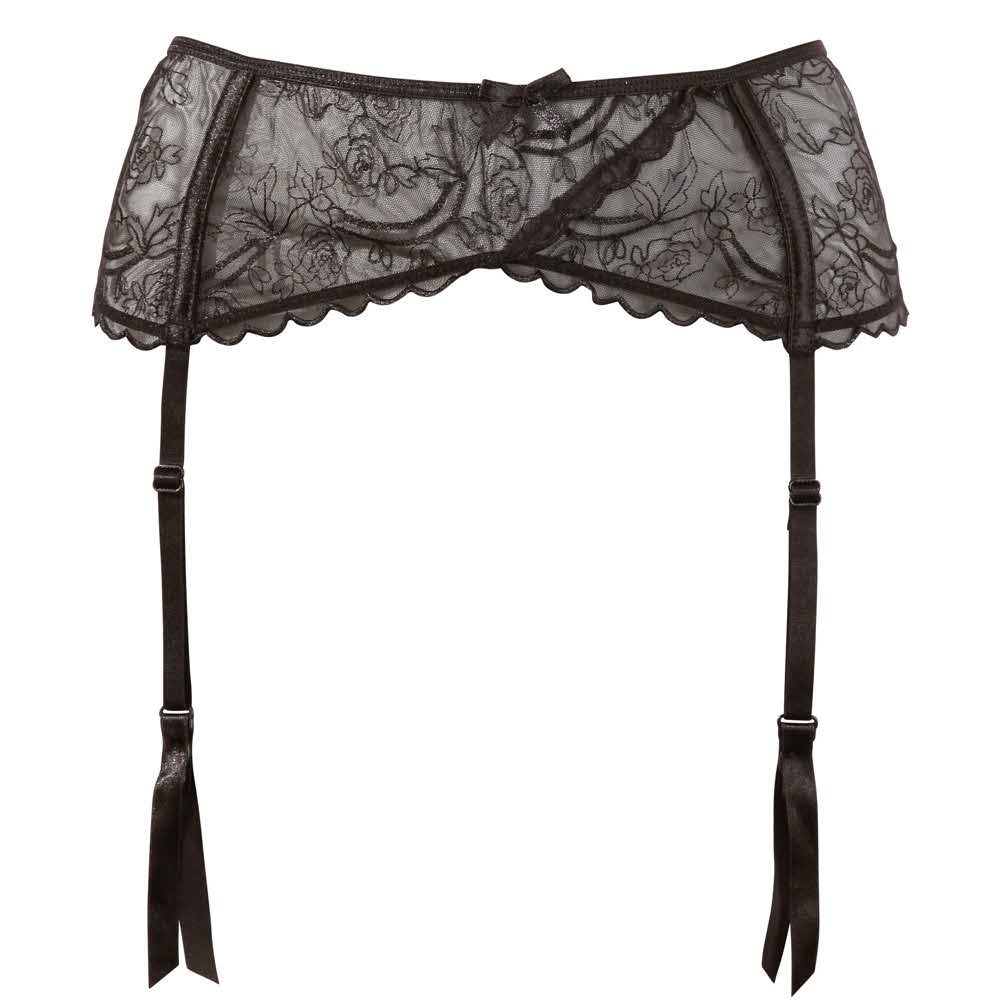 Suspender belt with four adjustable straps and a hook fastener with two rows of hooks. Transparent black material with delicate embroidery. 80% polyamide, 10% polyester, 10% spandex. Without stockings.