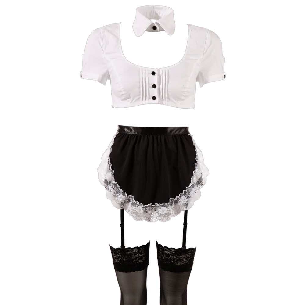 Complete outfit for your sexy service: short top, crotchless suspender briefs, stockings, apron, headband and ruffled choker. Top and choker: 98% cotton, 2% spandex, apron and headband: 90% polyester, 10% spandex, stockings: 100% polyamide. Black/white.