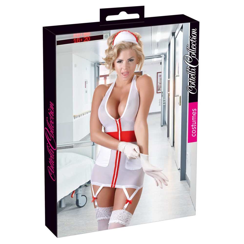 Seksowna pielęgniarka! Uwodzicielska sukienka wykonana z białego powernetu z czerwonymi wstawkami w kształcie krzyża z przodu. Zamek błyskawiczny na całej długości prowadzi przez wydłużoną wstawkę, krzyżująca się wstawka podkreśla talię. Z małymi kieszeniami z przodu do przechowywania wszelkiego rodzaju akcesoriów, dwa paski do pończoch i halter neck na szyi dla zniewalającego tyłu. Mała biała opaska na włosy z czerwoną falbanką sprawia, że stylizacja jest perfekcyjna. 90% poliamid, 10% spandex, opaska na włosy 95% poliester, 5% spandex. Bez pończoch.