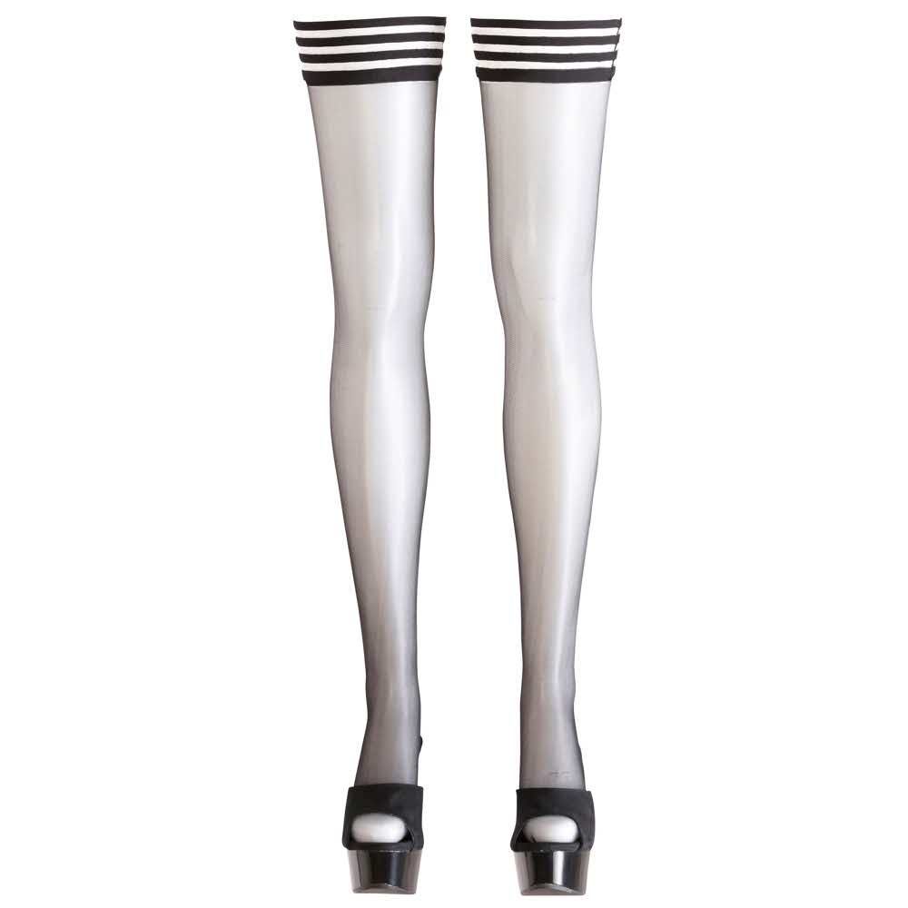 Dla żywych pszczół! Trzymaj pończochy z sprytnie pasiastą górą. Silikon w środku dla antypoślizgowego dopasowania. 17 den. Certyfikat Oeko-Tex. 90% poliamid, 10% elastan.