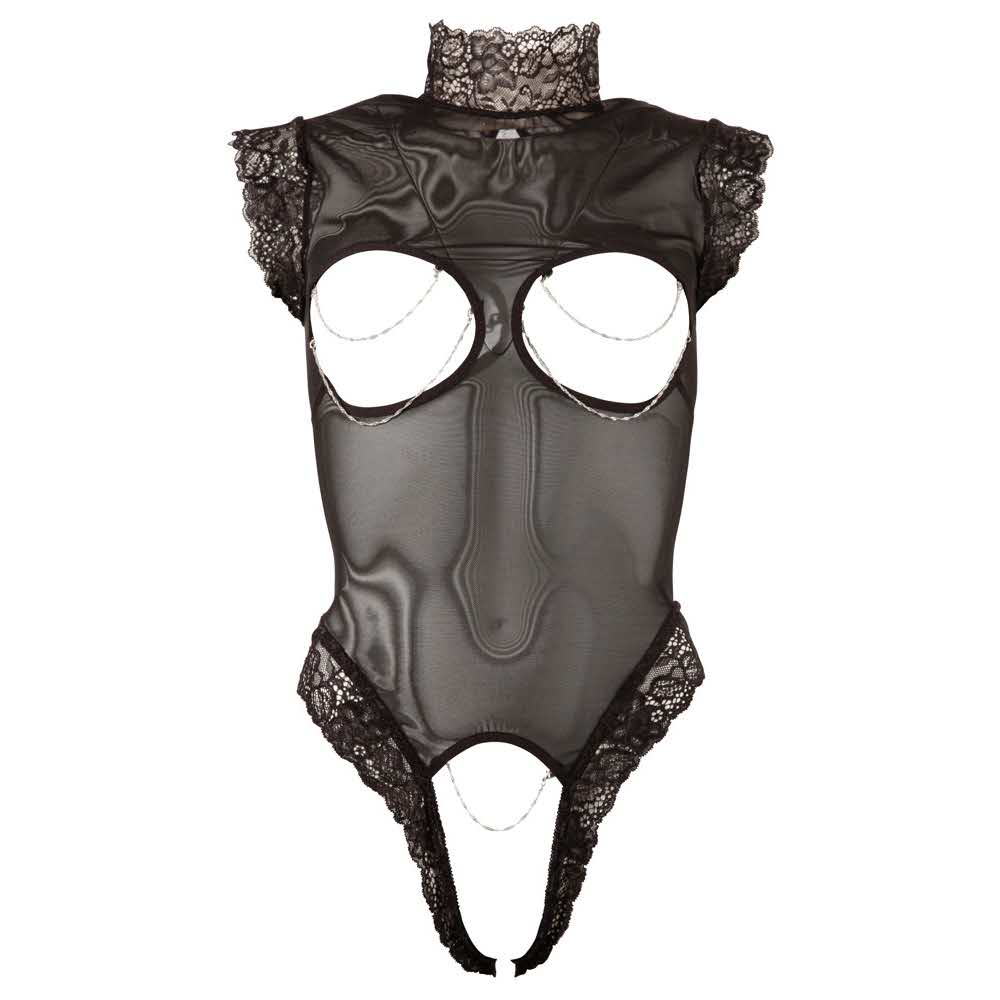 Więcej niż atrakcyjne! Czarny przezroczysty korpus z koronkowymi wykończeniami na ramionach, kołnierzykiem (2 guziki z tyłu) i wycięciami na nogi. Piersi i wstyd są otwarte i ozdobione zdejmowanymi łańcuchami. 90% poliamid, 10% elastan.