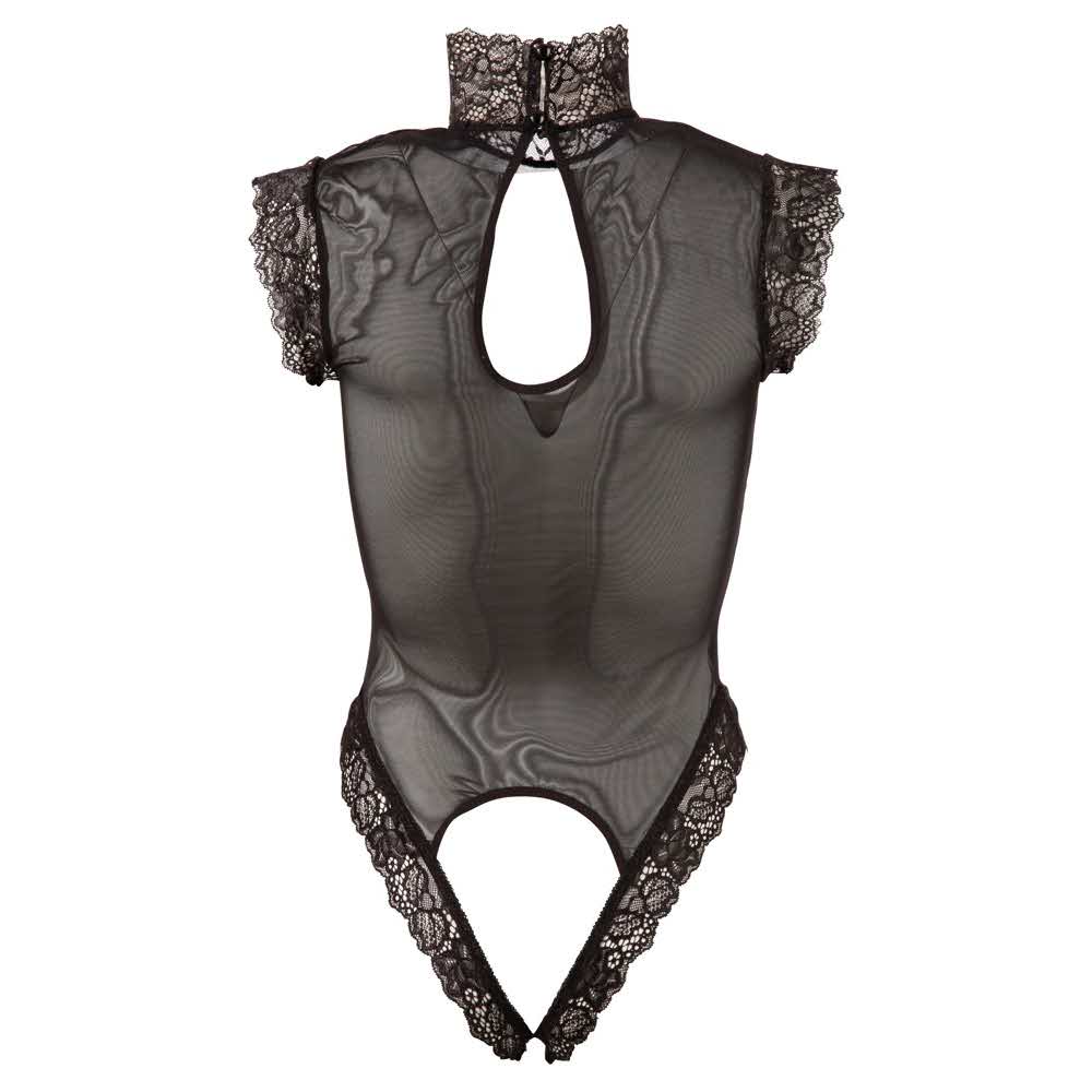 Więcej niż atrakcyjne! Czarny przezroczysty korpus z koronkowymi wykończeniami na ramionach, kołnierzykiem (2 guziki z tyłu) i wycięciami na nogi. Piersi i wstyd są otwarte i ozdobione zdejmowanymi łańcuchami. 90% poliamid, 10% elastan.