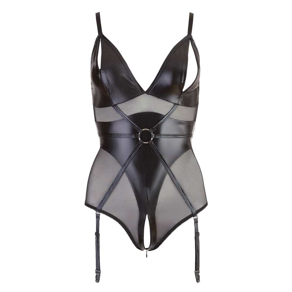 Błyszczący wet look i transparentny powernet w wyrafinowanym połączeniu! Czarne body od Cottelli BONDAGE z kółeczkiem pośrodku, małymi zamkami przy miseczkach i uroczym dwukierunkowym zamkiem w kroku może zrobić o wiele więcej niż tylko seksownie się ubrać! Ponieważ z tyłu jednoczęściowego stroju erotycznego zaskakują 2 pętelki, którymi można przymocować ramiona do lubieżnych zabaw w bondage. Ramiączka regulowane, szelki odpinane i regulowane. 92% poliester, 8% elastan siatka 90% poliamid, 10% elastan. Dostawa bez pończoch.