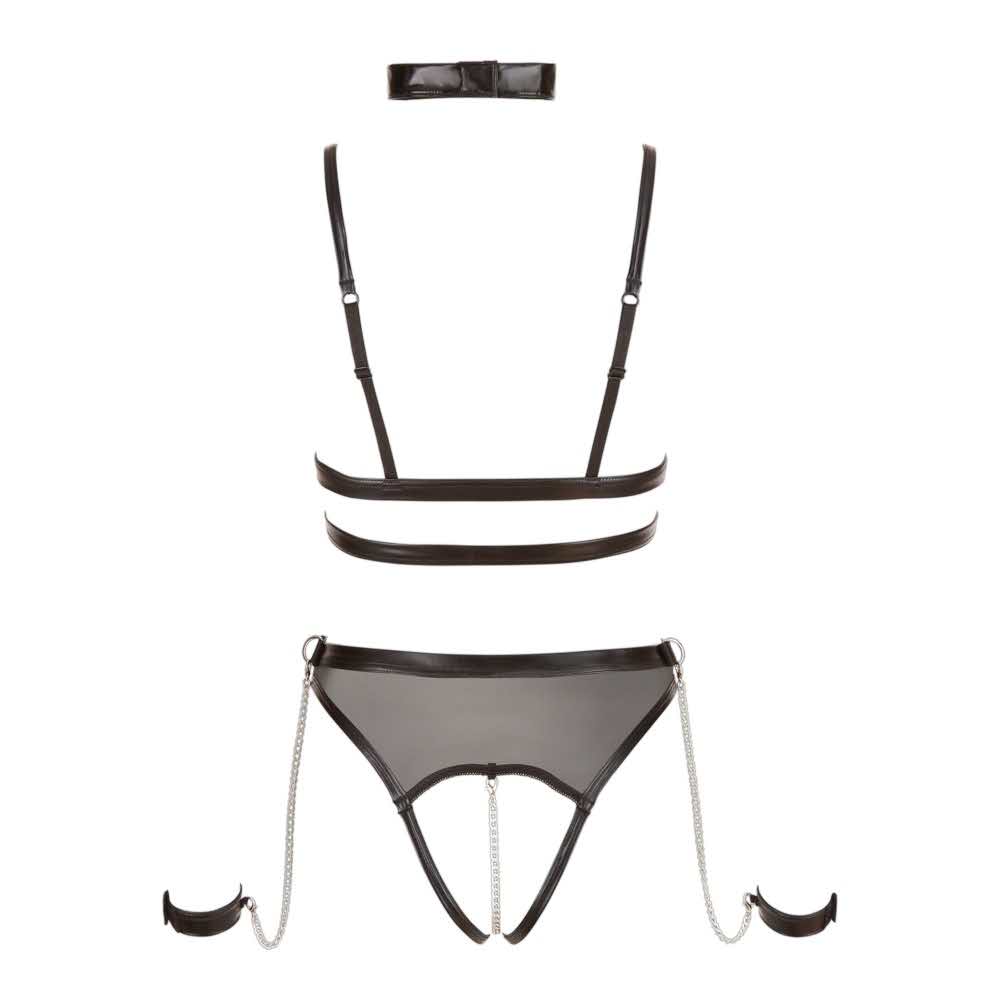 Seksowne ciało do gorących gier! Body Ouvert suspensoryczne Cottelli BONDAGE w stylu uprzęży wykonane z delikatnego powernetu z ekscytującymi detalami w stylu wet look. Rozcięte miseczki z zatrzaskami do otwierania. Całkowicie otwarte krocze posiada wyjmowany, stymulujący łańcuch krokowy. Dołączone do zestawu miękkie paski na kostki rąk z łańcuszkami karabinków (każdy o długości 28 cm) można łatwo zaczepić na bocznych pierścieniach pasa. Paski na kostkach z regulowanymi zapięciami na rzepy. Ramiączka i 2 paski do pończoch regulowane z przodu – paski do pończoch również odpinane. Zawiera kołnierz typu wet look z pierścieniem z przodu, zapięcie na rzep z tyłu. 92% poliester, 8% spandex siatka 90% poliamid, 10% spandex. Dostawa bez pończoch.
