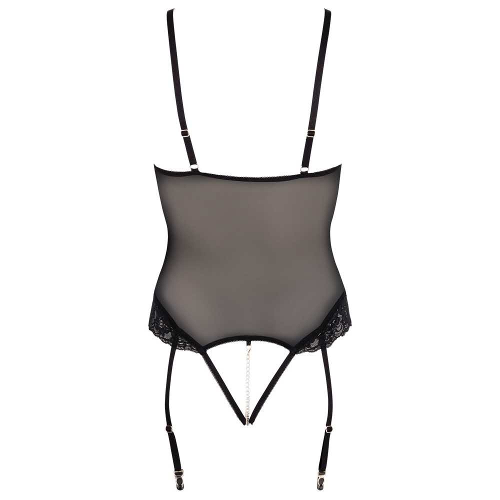 Przejrzyste, otwarte całkowite uwodzenie! Bezpiersiowy korpus szelki w Powernet i koronka z metalowymi detalami i akcesoriami wet look. Zdejmowany (karabińczyk) łańcuch stymulujący biegnie przez całkowicie otwarte krocze. Paski regulowane, szelki regulowane i odpinane. Paski udowe połączone krótkim łańcuszkiem z odpinanymi (karabińczykowymi) kajdankami. Paski i mankiety z zapięciem na rzep. Czarny. 90% poliamid, 10% elastan wet look 92% poliester, 8% elastan.