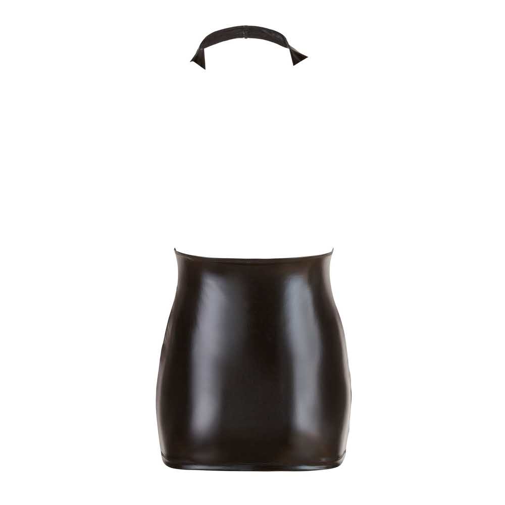 Tight wet look dress with a plunging neckline and a fully bare back. Halterneck straps.