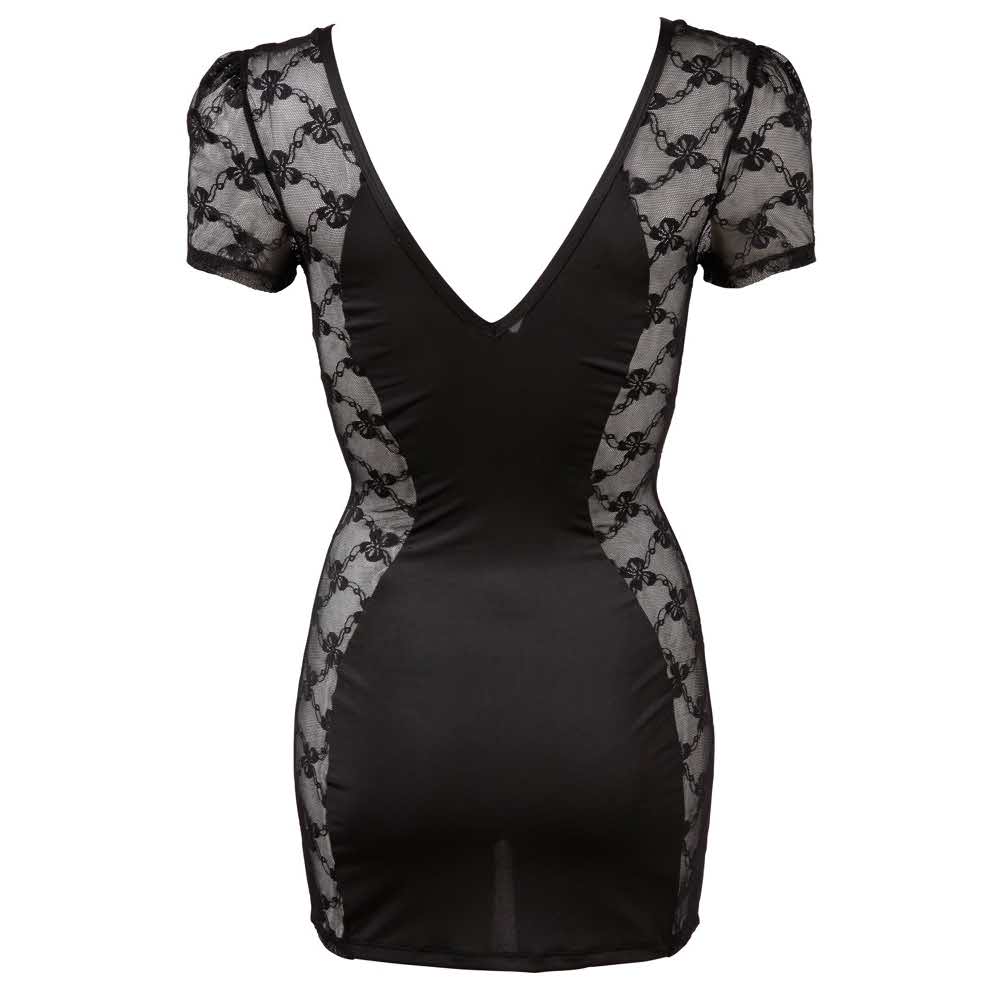 Mała czarna sukienka, w której można się zakochać! Obcisła, prześwitująca sukienka bieliźniana, po bokach wykonana z delikatnej koronki. Z krótkimi rękawami oraz głębokim dekoltem z przodu i z tyłu. Dwukierunkowy zamek błyskawiczny z przodu sprawia, że seksowny wygląd jest perfekcyjny. 60% poliester, 30% poliamid, 10% spandex.
