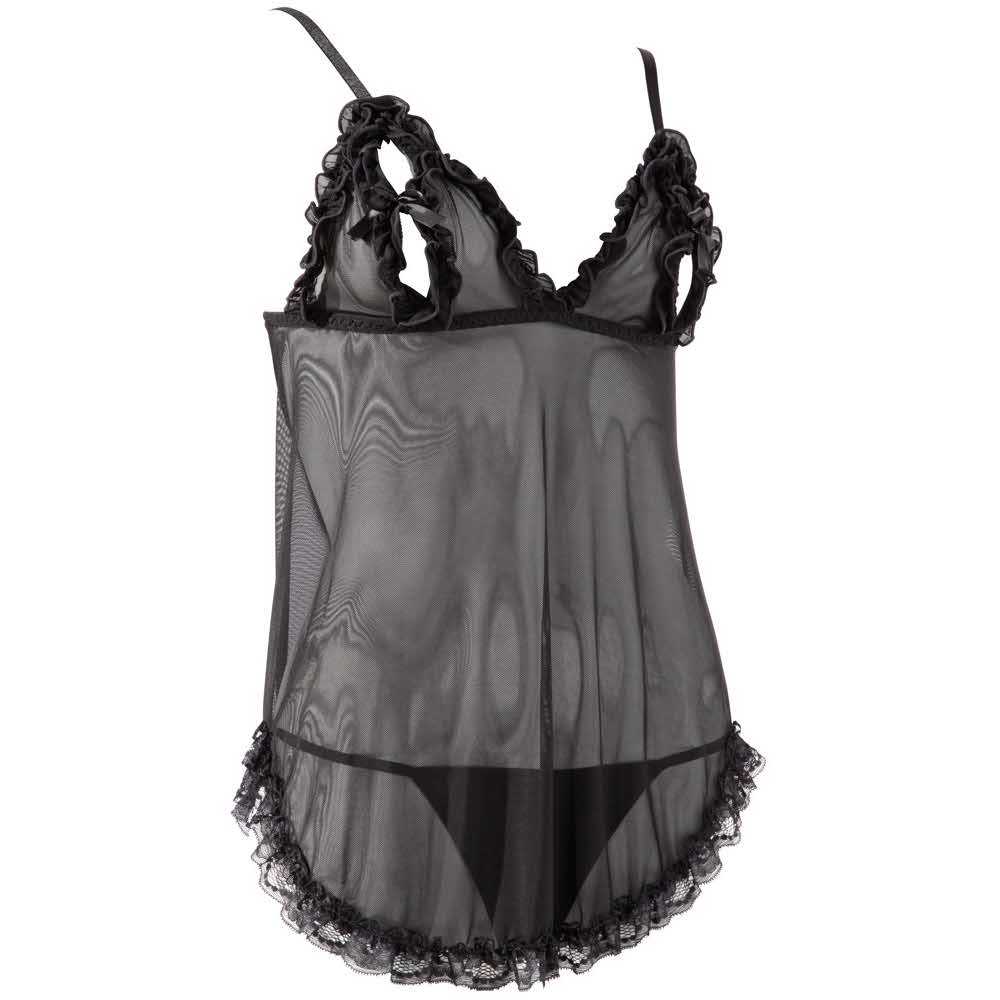 Czarne uwodzenie! Babydoll z regulowanymi ramiączkami i zapięciem na haftki z tyłu. Otwarte miseczki zamykane są na małą kokardkę, obszycie wykonane jest z koronki. Stringi w komplecie. 94% poliamid, 6% poliester.